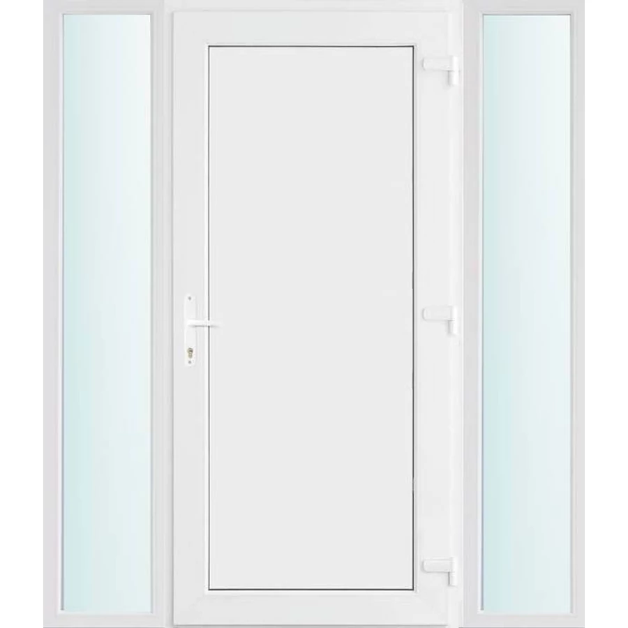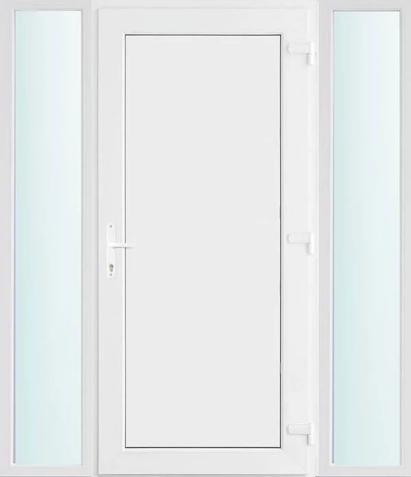 Kiváló hőszigetelésű műanyag bejárati ajtó 5 kamrás profilból, 70 mm beépítési mélységgel, tokban körbefutó idomacél merevítéssel. Vasalat: kilincsműködtetésű, VORNE 5 pontos ajtózárral, 3 db 3D erősített ajtópánttal, 20mm magas hőhídmentes alumínium küszöbbel. Dupla szürke ütközőtömítéssel rendelkezik. Üvegezése "SAVMART" katedrál 2 rétegű Szuperlágybevonatos thermo üveg, 24 mm vastagságban, UG értéke: 1.0 W/m2K . A bejárati ajtó mindkét oldalán fehér színű. Nyitásmódja befelé nyíló, nyitásiránya jobbos ( bentről nézve a zsanér a jobb oldalon helyezkedik el ). Tényleges tokkülmérete: 158 cm széles 208 cm magas. 98 cm széles 208 cm magas bejárati ajtóból, és 2 darab 30 cm széles 208 cm magas fix "SAVMART" üvegezésű ( nem nyitható) oldalvilágítóból áll. ( 3 külön elem ami beépítéskor összeszerelendő). A nyílászáró ára nem tartalmazza a KILINCSET és a ZÁRBETÉTET a beszereléshez szükséges segédanyagokat (falkampó, csavar, pur-hab..stb.), külső-belső takaróléceket.