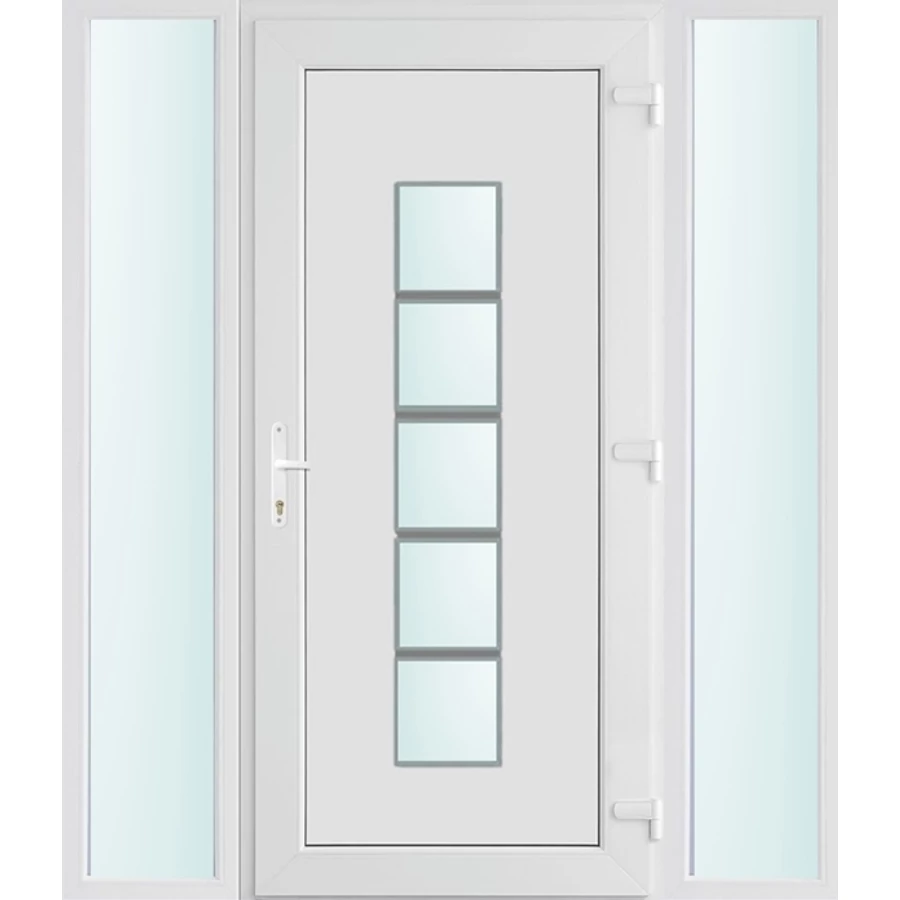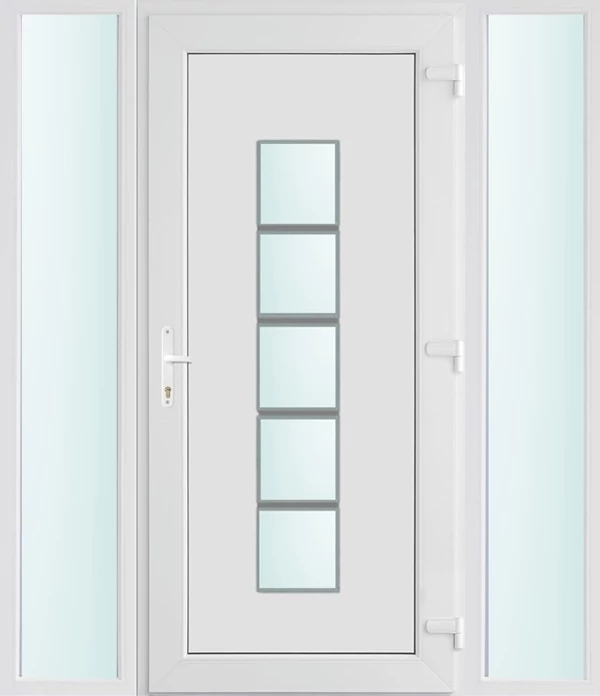 Kiváló hőszigetelésű műanyag bejárati ajtó 5 kamrás profilból, 70 mm beépítési mélységgel, tokban körbefutó idomacél merevítéssel. Vasalat: kilincsműködtetésű, VORNE 5 pontos ajtózárral, 3 db 3D erősített ajtópánttal, 20mm magas hőhídmentes alumínium küszöbbel. Dupla szürke ütközőtömítéssel rendelkezik. Üvegezése "SAVMART" katedrál 2 rétegű Szuperlágybevonatos thermo üveg, 24 mm vastagságban, UG értéke: 1.0 W/m2K . A bejárati ajtó mindkét oldalán fehér színű. Nyitásmódja befelé nyíló, nyitásiránya jobbos ( bentről nézve a zsanér a jobb oldalon helyezkedik el ). Tényleges tokkülmérete: 158 cm széles 208 cm magas. 98 cm széles 208 cm magas bejárati ajtóból, és 2 darab 30 cm széles 208 cm magas fix "SAVMART" üvegezésű ( nem nyitható) oldalvilágítóból áll. ( 3 külön elem ami beépítéskor összeszerelendő). A nyílászáró ára nem tartalmazza a KILINCSET és a ZÁRBETÉTET a beszereléshez szükséges segédanyagokat (falkampó, csavar, pur-hab..stb.), külső-belső takaróléceket.