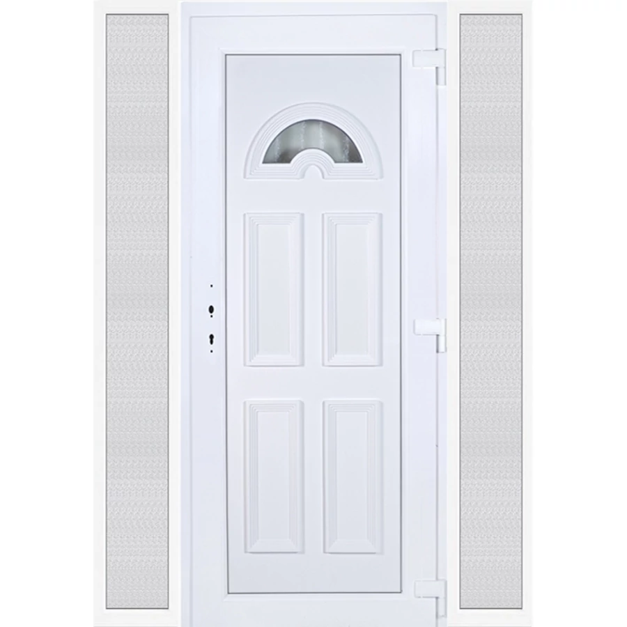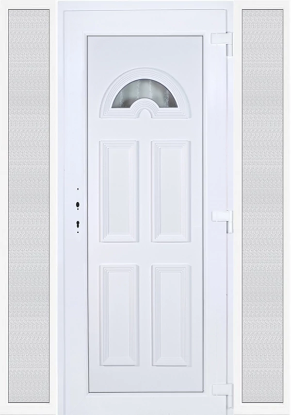 EXTRA hőszigetelésű műanyag bejárati ajtó 5 kamrás profilból, 70 mm beépítési mélységgel, tokban körbefutó idomacél merevítéssel. Vasalat: kilincsműködtetésű, 5 pontos ajtózárral, 3 db 3D erősített ajtópánttal, 20mm magas hőhídmentes alumínium küszöbbel, + 20mm purenittel a küszöb alatt. Dupla szürke ütközőtömítéssel rendelkezik. Üvegezése "savmart" katedrál 3 RÉTEGŰ Szuperlágybevonatos thermo üveg, 42 mm vastagságban, UG értéke: 0,7 W/m2K . A bejárati ajtó mindkét oldalán fehér színű. Nyitásmódja befelé nyíló, nyitásiránya jobbos ( bentről nézve a zsanér a jobb oldalon helyezkedik el ). Tényleges tokkülmérete: 158 cm széles 209 cm magas. 98 cm széles 209 cm magas bejárati ajtóból, és 2 darab 30 cm széles 209 cm magas fix "savmart" üvegezésű ( nem nyitható) oldalvilágítóból áll. ( 3 külön elem ami beépítéskor összeszerelendő). A nyílászáró ára nem tartalmazza a KILINCSET és a ZÁRBETÉTET a beszereléshez szükséges segédanyagokat (falkampó, csavar, pur-hab..stb.), külső-belső takaróléceket.