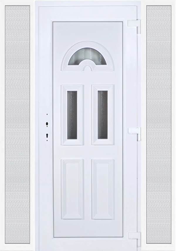 EXTRA hőszigetelésű műanyag bejárati ajtó 5 kamrás profilból, 70 mm beépítési mélységgel, tokban körbefutó idomacél merevítéssel. Vasalat: kilincsműködtetésű, 5 pontos ajtózárral, 3 db 3D erősített ajtópánttal, 20mm magas hőhídmentes alumínium küszöbbel, + 20mm purenittel a küszöb alatt. Dupla szürke ütközőtömítéssel rendelkezik. Üvegezése "savmart" katedrál 3 RÉTEGŰ Szuperlágybevonatos thermo üveg, 42 mm vastagságban, UG értéke: 0,7 W/m2K . A bejárati ajtó mindkét oldalán fehér színű. Nyitásmódja befelé nyíló, nyitásiránya jobbos ( bentről nézve a zsanér a jobb oldalon helyezkedik el ). Tényleges tokkülmérete: 158 cm széles 209 cm magas. 98 cm széles 209 cm magas bejárati ajtóból, és 2 darab 30 cm széles 209 cm magas fix "savmart" üvegezésű ( nem nyitható) oldalvilágítóból áll. ( 3 külön elem ami beépítéskor összeszerelendő). A nyílászáró ára nem tartalmazza a KILINCSET és a ZÁRBETÉTET a beszereléshez szükséges segédanyagokat (falkampó, csavar, pur-hab..stb.), külső-belső takaróléceket.