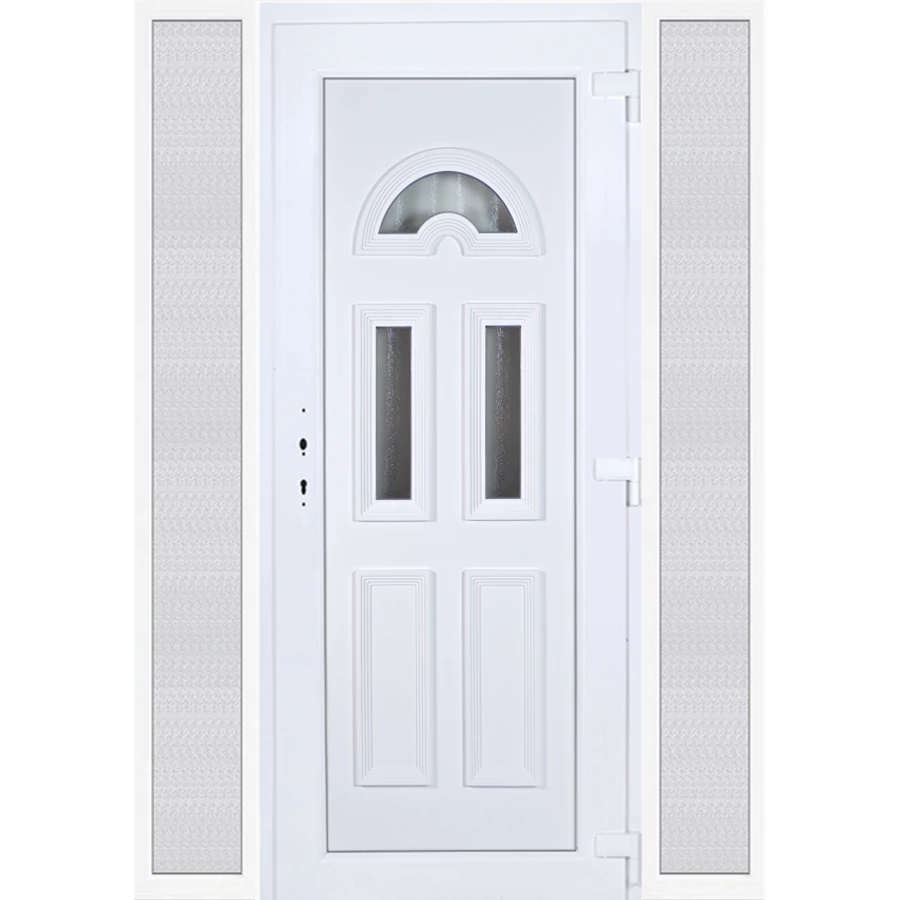 Kiváló hőszigetelésű műanyag bejárati ajtó 5 kamrás profilból, 70 mm beépítési mélységgel, tokban körbefutó idomacél merevítéssel. Vasalat: kilincsműködtetésű, 5 pontos ajtózárral, 3 db 3D erősített ajtópánttal, 35mm magas hőhídmentes alumínium küszöbbel. Dupla szürke ütközőtömítéssel rendelkezik. Üvegezése "GRÍZ" katedrál 2 rétegű Szuperlágybevonatos thermo üveg, 24 mm vastagságban, UG értéke: 1.0 W/m2K . A bejárati ajtó mindkét oldalán fehér színű. Nyitásmódja befelé nyíló, nyitásiránya jobbos ( bentről nézve a zsanér a jobb oldalon helyezkedik el ). Tényleges tokkülmérete: 158 cm széles 208,5 cm magas. 98 cm széles 208,5 cm magas bejárati ajtóból, és 2 darab 30 cm széles 208,5 cm magas fix "GRÍZ" üvegezésű ( nem nyitható) oldalvilágítóból áll. ( 3 külön elem ami beépítéskor összeszerelendő). A nyílászáró ára nem tartalmazza a KILINCSET és a ZÁRBETÉTET a beszereléshez szükséges segédanyagokat (falkampó, csavar, pur-hab..stb.), külső-belső takaróléceket.