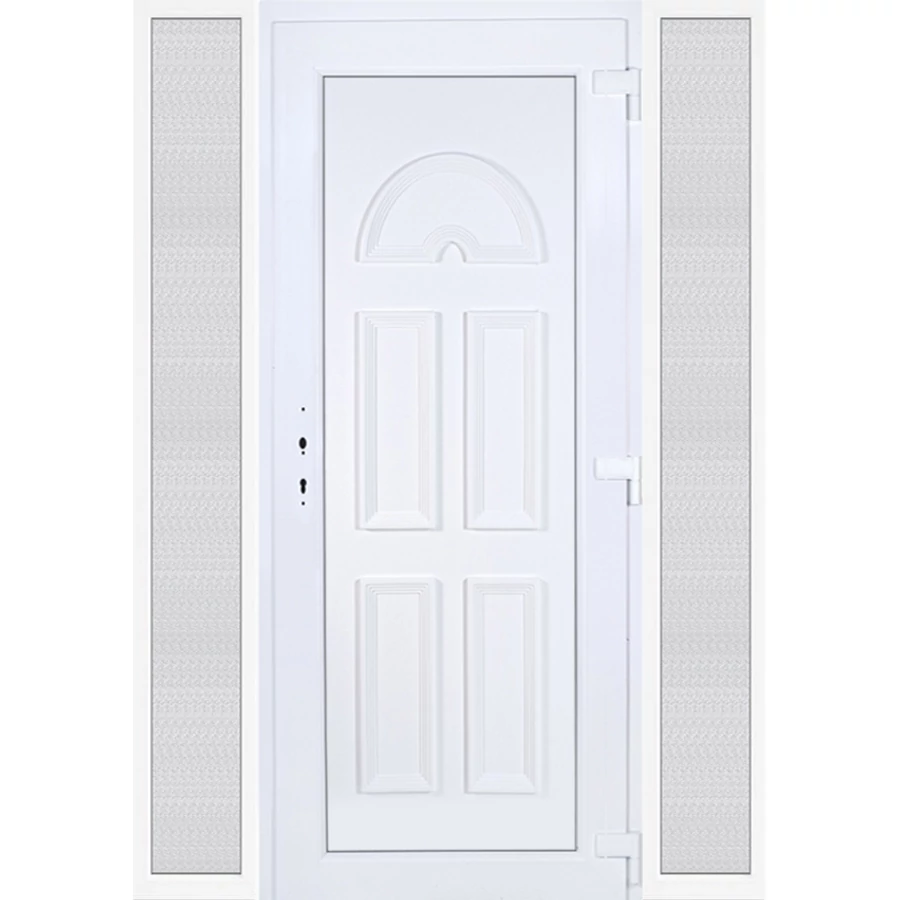 EXTRA hőszigetelésű műanyag bejárati ajtó 5 kamrás profilból, 70 mm beépítési mélységgel, tokban körbefutó idomacél merevítéssel. Vasalat: kilincsműködtetésű, 5 pontos ajtózárral, 3 db 3D erősített ajtópánttal, 20mm magas hőhídmentes alumínium küszöbbel, + 20mm purenittel a küszöb alatt. Dupla szürke ütközőtömítéssel rendelkezik. Üvegezése "savmart" katedrál 3 RÉTEGŰ Szuperlágybevonatos thermo üveg, 42 mm vastagságban, UG értéke: 0,7 W/m2K . A bejárati ajtó mindkét oldalán fehér színű. Nyitásmódja befelé nyíló, nyitásiránya jobbos ( bentről nézve a zsanér a jobb oldalon helyezkedik el ). Tényleges tokkülmérete: 158 cm széles 209 cm magas. 98 cm széles 209 cm magas bejárati ajtóból, és 2 darab 30 cm széles 209 cm magas fix "savmart" üvegezésű ( nem nyitható) oldalvilágítóból áll. ( 3 külön elem ami beépítéskor összeszerelendő). A nyílászáró ára nem tartalmazza a KILINCSET és a ZÁRBETÉTET a beszereléshez szükséges segédanyagokat (falkampó, csavar, pur-hab..stb.), külső-belső takaróléceket.