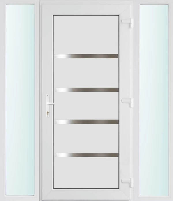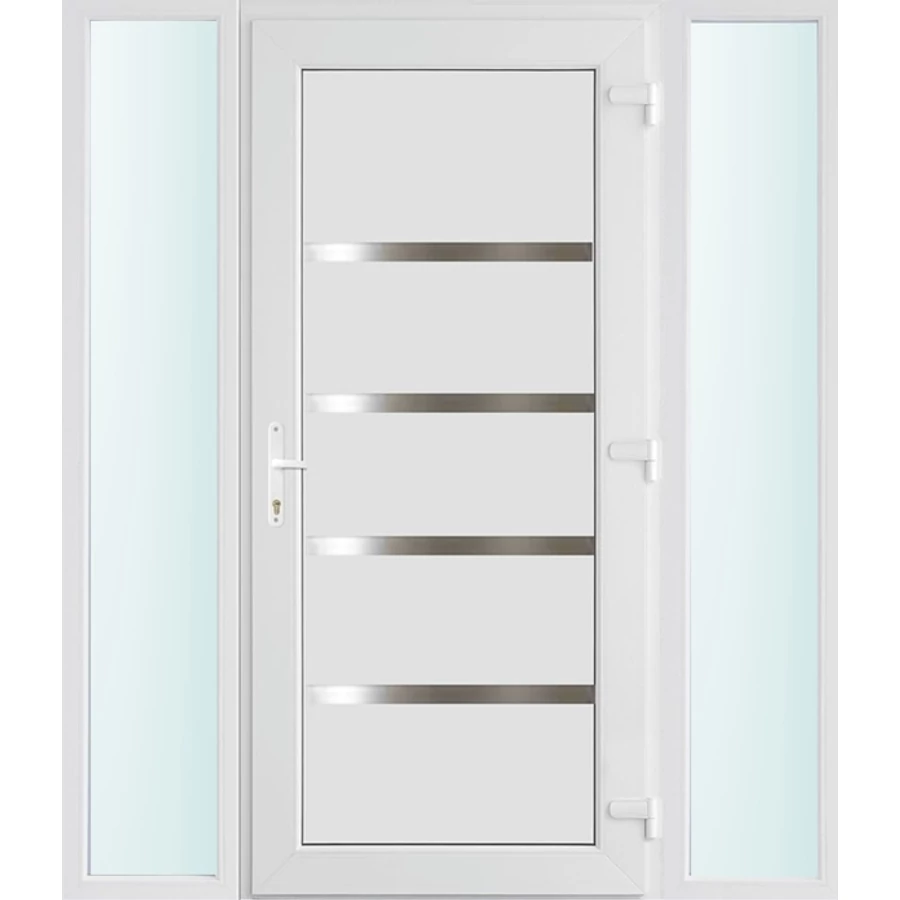 Kiváló hőszigetelésű műanyag bejárati ajtó 5 kamrás Pro line profilból, 70 mm beépítési mélységgel, tokban körbefutó idomacél merevítéssel. Vasalat: kilincsműködtetésű, VORNE 5 pontos ajtózárral, 3 db 3D erősített ajtópánttal, 20mm magas hőhídmentes alumínium küszöbbel. Dupla szürke ütközőtömítéssel rendelkezik. Üvegezése "SAVMART" katedrál 3 rétegű Szuperlágybevonatos thermo üveg, 40 mm vastagságban, UG értéke: 0.7 W/m2K . A bejárati ajtó mindkét oldalán fehér színű. Nyitásmódja befelé nyíló, nyitásiránya jobbos ( bentről nézve a zsanér a bal oldalon helyezkedik el ). Tényleges tokkülmérete: 158 cm széles 208 cm magas A nyílászáró ára nem tartalmazza a KILINCSET és a ZÁRBETÉTET a beszereléshez szükséges segédanyagokat (falkampó, csavar, pur-hab..stb.), külső-belső takaróléceket.