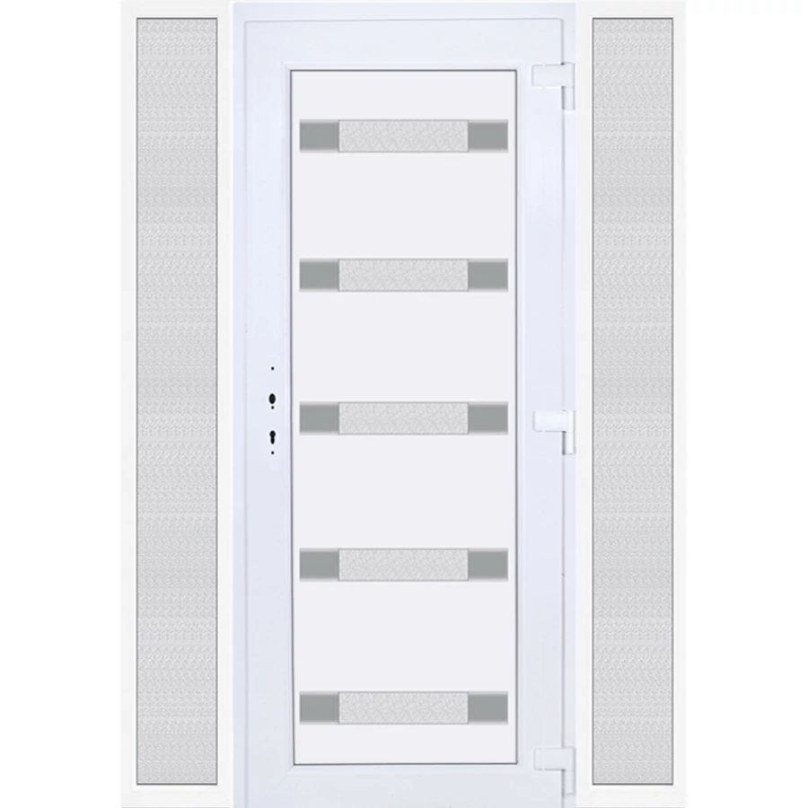 EXTRA hőszigetelésű műanyag bejárati ajtó 5 kamrás profilból, 70 mm beépítési mélységgel, tokban körbefutó idomacél merevítéssel. Vasalat: kilincsműködtetésű, 5 pontos ajtózárral, 3 db 3D erősített ajtópánttal, 20mm magas hőhídmentes alumínium küszöbbel, + 20mm purenittel a küszöb alatt. Dupla szürke ütközőtömítéssel rendelkezik. Üvegezése "savmart" katedrál 3 RÉTEGŰ Szuperlágybevonatos thermo üveg, 42 mm vastagságban, UG értéke: 0,7 W/m2K . A bejárati ajtó mindkét oldalán fehér színű. Nyitásmódja befelé nyíló, nyitásiránya jobbos ( bentről nézve a zsanér a jobb oldalon helyezkedik el ). Tényleges tokkülmérete: 158 cm széles 209 cm magas. 98 cm széles 209 cm magas bejárati ajtóból, és 2 darab 30 cm széles 209 cm magas fix "savmart" üvegezésű ( nem nyitható) oldalvilágítóból áll. ( 3 külön elem ami beépítéskor összeszerelendő). A nyílászáró ára nem tartalmazza a KILINCSET és a ZÁRBETÉTET a beszereléshez szükséges segédanyagokat (falkampó, csavar, pur-hab..stb.), külső-belső takaróléceket.