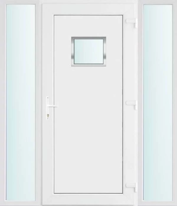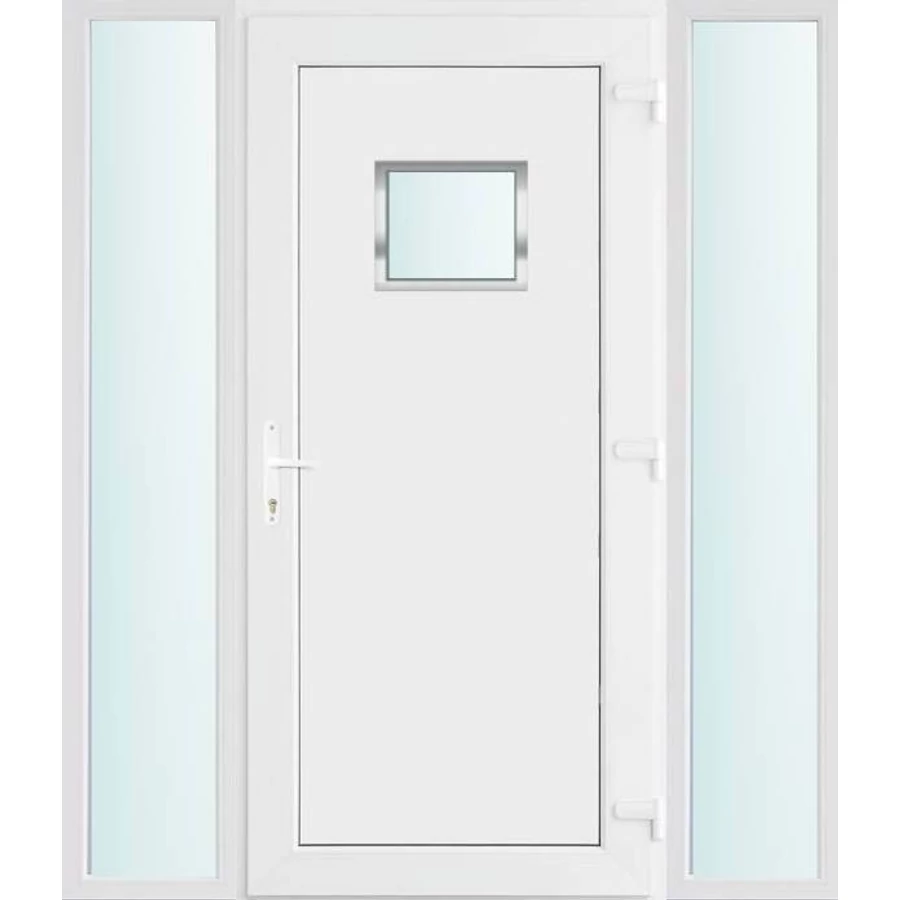 Kiváló hőszigetelésű műanyag bejárati ajtó 5 kamrás profilból, 70 mm beépítési mélységgel, tokban körbefutó idomacél merevítéssel. Vasalat: kilincsműködtetésű, VORNE 5 pontos ajtózárral, 3 db 3D erősített ajtópánttal, 20mm magas hőhídmentes alumínium küszöbbel. Dupla szürke ütközőtömítéssel rendelkezik. Üvegezése "SAVMART" katedrál 2 rétegű Szuperlágybevonatos thermo üveg, 24 mm vastagságban, UG értéke: 1.0 W/m2K . A bejárati ajtó mindkét oldalán fehér színű. Nyitásmódja befelé nyíló, nyitásiránya jobbos ( bentről nézve a zsanér a jobb oldalon helyezkedik el ). Tényleges tokkülmérete: 158 cm széles 208 cm magas. 98 cm széles 208 cm magas bejárati ajtóból, és 2 darab 30 cm széles 208 cm magas fix "SAVMART" üvegezésű ( nem nyitható) oldalvilágítóból áll. ( 3 külön elem ami beépítéskor összeszerelendő). A nyílászáró ára nem tartalmazza a KILINCSET és a ZÁRBETÉTET a beszereléshez szükséges segédanyagokat (falkampó, csavar, pur-hab..stb.), külső-belső takaróléceket.