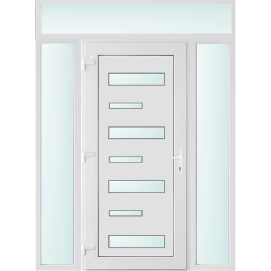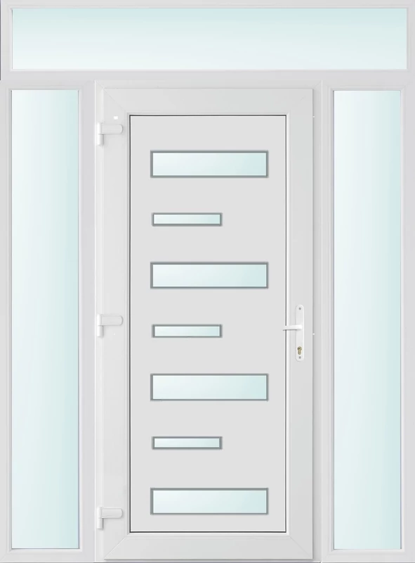 Műanyag bejárati ajtó 160x240 balos Alberta 7 üveges 3 rétegű üveggel extra vastag hőszigetelt panellal felül+oldalvilágítóval 5 kamrás fehér