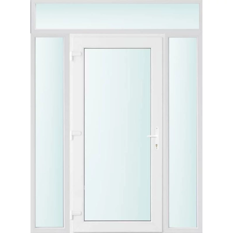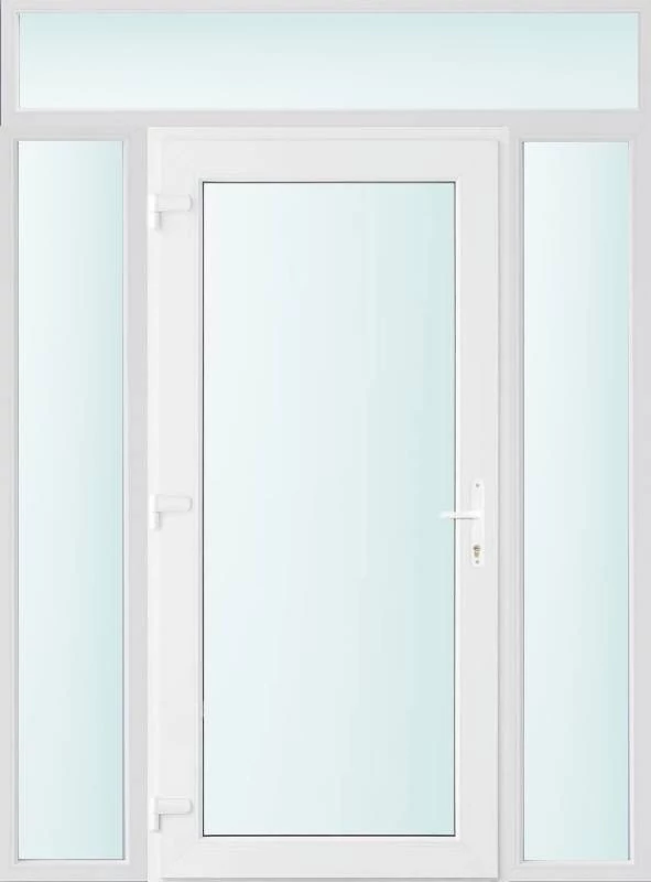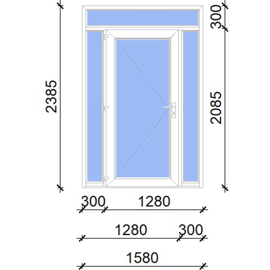 Kiváló hőszigetelésű műanyag bejárati ajtó 5 kamrás profilból, 70 mm beépítési mélységgel, tokban körbefutó idomacél merevítéssel. Vasalat: kilincsműködtetésű, VORNE 5 pontos ajtózárral, 3 db 3D erősített ajtópánttal, 20mm magas hőhídmentes alumínium küszöbbel. Dupla szürke ütközőtömítéssel rendelkezik. Üvegezése "VÍZTISZTA" 2 rétegű Szuper lágy bevonatos thermo üveg, 24 mm vastagságban, UG értéke: 1.0 W/m2K . A bejárati ajtó mindkét oldalán fehér színű. Nyitásmódja befelé nyíló, nyitásiránya balos ( bentről nézve a zsanér a bal oldalon helyezkedik el ). Tényleges tokkülmérete: 158 cm széles 238 cm magas. 98 cm széles 208 cm magas bejárati ajtóból, és 2 darab 30 cm széles 208 cm magas fix "SAVMART vagy VÍZTISZTA" üvegezésű ( nem nyitható) oldalvilágítóból és egy 158 cm széles 30 cm magas fix "SAVMART vagy VÍZTISZTA" üvegezésű ( nem nyitható) felülvilágítóból áll. ( négy külön elem ami beépítéskor összeszerelendő). A nyílászáró ára nem tartalmazza a KILINCSET és a ZÁRBETÉTET a beszereléshez szükséges segédanyagokat (falkampó, csavar, pur-hab..stb.), külső-belső takaróléceket.