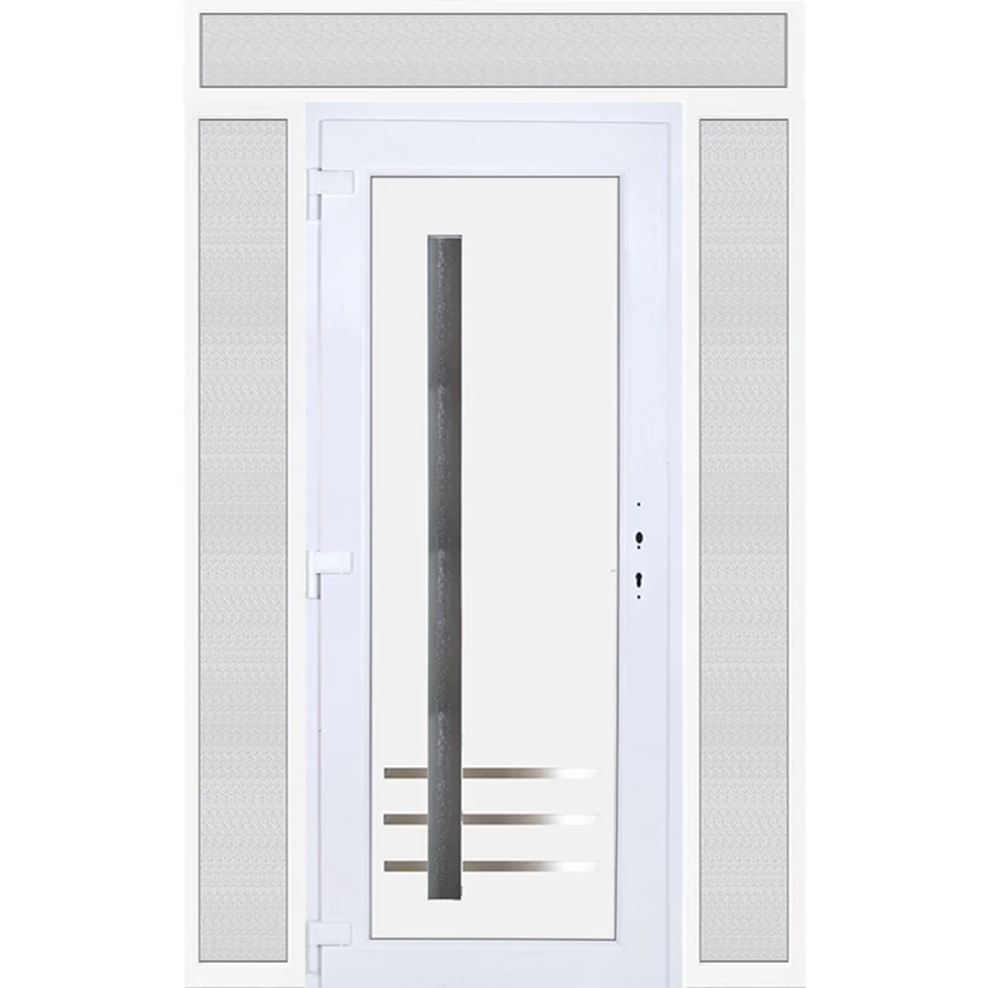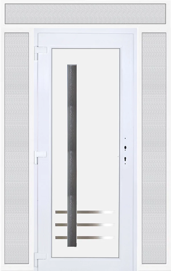 Kiváló hőszigetelésű műanyag bejárati ajtó 5 kamrás profilból, 70 mm beépítési mélységgel, tokban körbefutó idomacél merevítéssel. Vasalat: kilincsműködtetésű, 5 pontos ajtózárral, 3 db 3D erősített ajtópánttal, 35mm magas hőhídmentes alumínium küszöbbel. Dupla szürke ütközőtömítéssel rendelkezik. Üvegezése "GRÍZ" katedrál 2 rétegű Szuperlágybevonatos thermo üveg, 24 mm vastagságban, UG értéke: 1.0 W/m2K . A bejárati ajtó mindkét oldalán fehér színű. Nyitásmódja befelé nyíló, nyitásiránya balos ( bentről nézve a zsanér a bal oldalon helyezkedik el ). Tényleges tokkülmérete: 158 cm széles 238,5 cm magas. 98 cm széles 208,5 cm magas bejárati ajtóból, és 2 darab 30 cm széles 208,5 cm magas fix "GRÍZ" üvegezésű ( nem nyitható) oldalvilágítóból és egy 158 cm széles 30 cm magas fix "GRÍZ" üvegezésű ( nem nyitható) felülvilágítóból áll. ( négy külön elem ami beépítéskor összeszerelendő). A nyílászáró ára nem tartalmazza a KILINCSET és a ZÁRBETÉTET a beszereléshez szükséges segédanyagokat (falkampó, csavar, pur-hab..stb.), külső-belső takaróléceket.