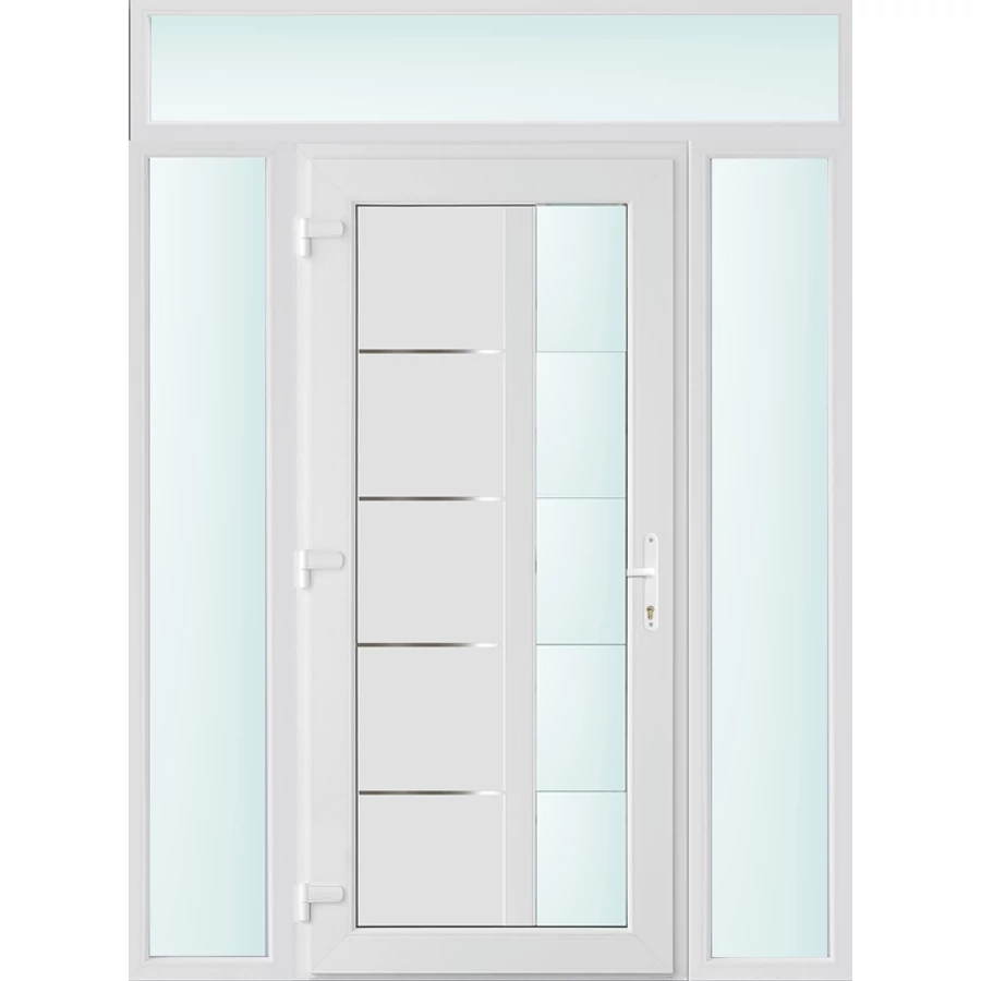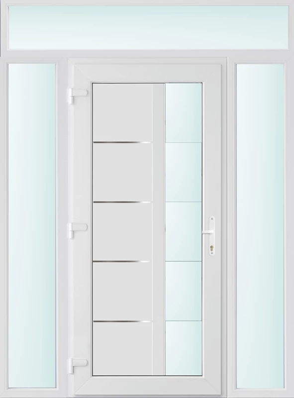 Kiváló hőszigetelésű műanyag bejárati ajtó 5 kamrás profilból, 70 mm beépítési mélységgel, tokban körbefutó idomacél merevítéssel. Vasalat: kilincsműködtetésű, VORNE 5 pontos ajtózárral, 3 db 3D erősített ajtópánttal, 20mm magas hőhídmentes alumínium küszöbbel. Dupla szürke ütközőtömítéssel rendelkezik. Üvegezése "SAVMART" katedrál 2 rétegű Szuperlágybevonatos thermo üveg, 24 mm vastagságban, UG értéke: 1.0 W/m2K . A bejárati ajtó mindkét oldalán fehér színű. Nyitásmódja befelé nyíló, nyitásiránya balos ( bentről nézve a zsanér a bal oldalon helyezkedik el ). Tényleges tokkülmérete: 158 cm széles 238 cm magas. 98 cm széles 208 cm magas bejárati ajtóból, és 2 darab 30 cm széles 208 cm magas fix "SAVMART" üvegezésű ( nem nyitható) oldalvilágítóból és egy 158 cm széles 30 cm magas fix "SAVMART" üvegezésű ( nem nyitható) felülvilágítóból áll. ( négy külön elem ami beépítéskor összeszerelendő). A nyílászáró ára nem tartalmazza a KILINCSET és a ZÁRBETÉTET a beszereléshez szükséges segédanyagokat (falkampó, csavar, pur-hab..stb.), külső-belső takaróléceket.