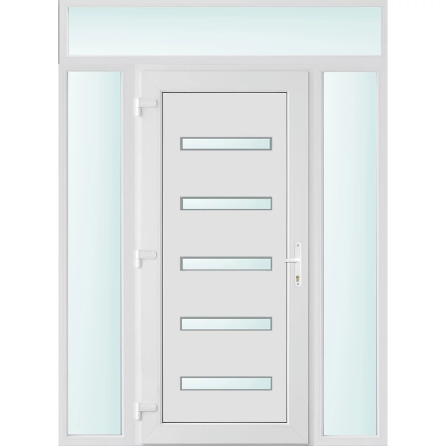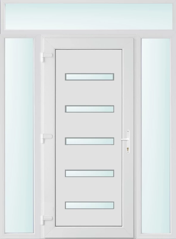 Kiváló hőszigetelésű műanyag bejárati ajtó 5 kamrás profilból, 70 mm beépítési mélységgel, tokban körbefutó idomacél merevítéssel. Vasalat: kilincsműködtetésű, VORNE 5 pontos ajtózárral, 3 db 3D erősített ajtópánttal, 20mm magas hőhídmentes alumínium küszöbbel. Dupla szürke ütközőtömítéssel rendelkezik. Üvegezése "SAVMART" katedrál 2 rétegű Szuperlágybevonatos thermo üveg, 24 mm vastagságban, UG értéke: 1.0 W/m2K . A bejárati ajtó mindkét oldalán fehér színű. Nyitásmódja befelé nyíló, nyitásiránya balos ( bentről nézve a zsanér a bal oldalon helyezkedik el ). Tényleges tokkülmérete: 158 cm széles 238 cm magas. 98 cm széles 208 cm magas bejárati ajtóból, és 2 darab 30 cm széles 208 cm magas fix "SAVMART" üvegezésű ( nem nyitható) oldalvilágítóból és egy 158 cm széles 30 cm magas fix "SAVMART" üvegezésű ( nem nyitható) felülvilágítóból áll. ( négy külön elem ami beépítéskor összeszerelendő). A nyílászáró ára nem tartalmazza a KILINCSET és a ZÁRBETÉTET a beszereléshez szükséges segédanyagokat (falkampó, csavar, pur-hab..stb.), külső-belső takaróléceket.