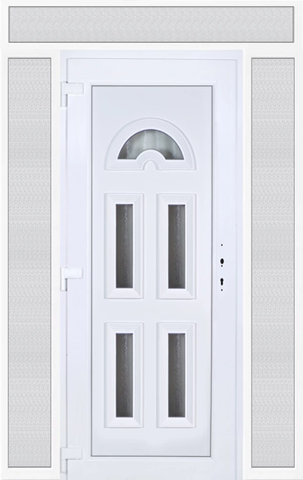 EXTRA hőszigetelésű műanyag bejárati ajtó 5 kamrás profilból, 70 mm beépítési mélységgel, tokban körbefutó idomacél merevítéssel. Vasalat: kilincsműködtetésű, 5 pontos ajtózárral, 3 db 3D erősített ajtópánttal, 20mm magas hőhídmentes alumínium küszöbbel, + 20mm purenittel a küszöb alatt. Dupla szürke ütközőtömítéssel rendelkezik. Üvegezése "savmart" katedrál 3 RÉTEGŰ Szuperlágybevonatos thermo üveg, 42 mm vastagságban, UG értéke: 0,7 W/m2K . A bejárati ajtó mindkét oldalán fehér színű. Nyitásmódja befelé nyíló, nyitásiránya balos ( bentről nézve a zsanér a bal oldalon helyezkedik el ). Tényleges tokkülmérete: 158 cm széles 239 cm magas. 98 cm széles 209 cm magas bejárati ajtóból, és 2 darab 30 cm széles 209 cm magas fix "savmart" üvegezésű ( nem nyitható) oldalvilágítóból és egy 158 cm széles 30 cm magas fix "savmart" üvegezésű ( nem nyitható) felülvilágítóból áll. ( négy külön elem ami beépítéskor összeszerelendő). A nyílászáró ára nem tartalmazza a KILINCSET és a ZÁRBETÉTET a beszereléshez szükséges segédanyagokat (falkampó, csavar, pur-hab..stb.), külső-belső takaróléceket.