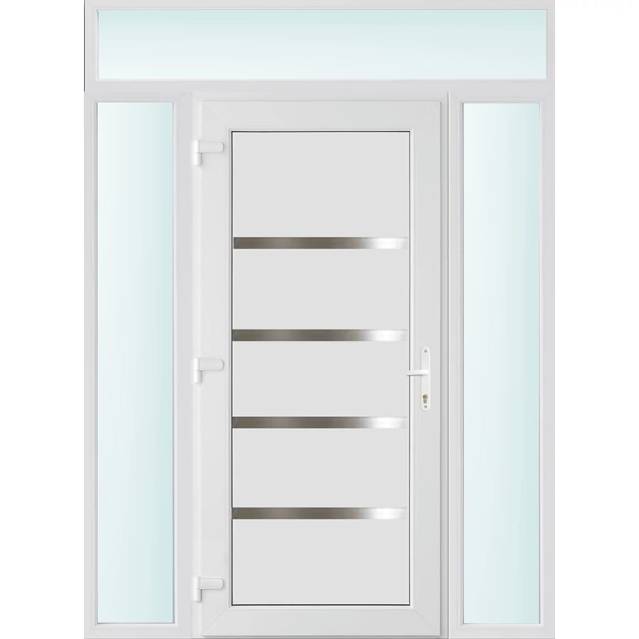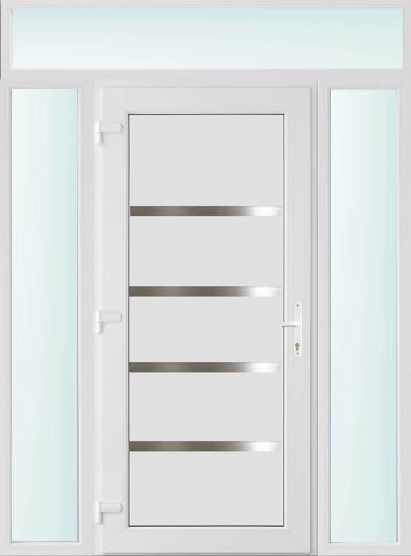 Kiváló hőszigetelésű műanyag bejárati ajtó 5 kamrás Pro line profilból, 70 mm beépítési mélységgel, tokban körbefutó idomacél merevítéssel. Vasalat: kilincsműködtetésű, VORNE 5 pontos ajtózárral, 3 db 3D erősített ajtópánttal, 20mm magas hőhídmentes alumínium küszöbbel. Dupla szürke ütközőtömítéssel rendelkezik. Üvegezése "SAVMART" katedrál 3 rétegű Szuperlágybevonatos thermo üveg, 40 mm vastagságban, UG értéke: 0.7 W/m2K . A bejárati ajtó mindkét oldalán fehér színű. Nyitásmódja befelé nyíló, nyitásiránya balos ( bentről nézve a zsanér a bal oldalon helyezkedik el ). Tényleges tokkülmérete: 158 cm széles 238 cm magas A nyílászáró ára nem tartalmazza a KILINCSET és a ZÁRBETÉTET a beszereléshez szükséges segédanyagokat (falkampó, csavar, pur-hab..stb.), külső-belső takaróléceket.