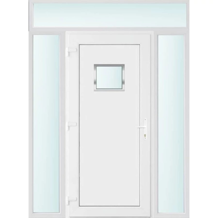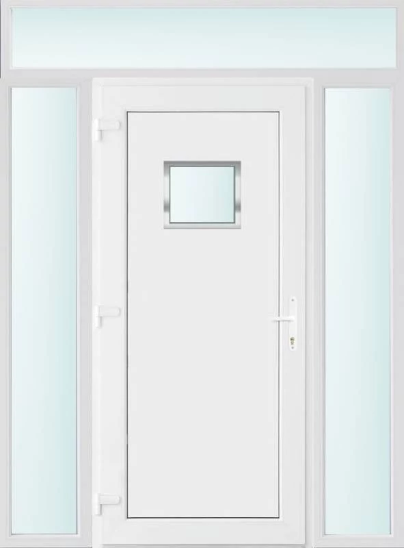 Kiváló hőszigetelésű műanyag bejárati ajtó 5 kamrás profilból, 70 mm beépítési mélységgel, tokban körbefutó idomacél merevítéssel. Vasalat: kilincsműködtetésű, VORNE 5 pontos ajtózárral, 3 db 3D erősített ajtópánttal, 20mm magas hőhídmentes alumínium küszöbbel. Dupla szürke ütközőtömítéssel rendelkezik. Üvegezése "SAVMART" katedrál 2 rétegű Szuperlágybevonatos thermo üveg, 24 mm vastagságban, UG értéke: 1.0 W/m2K . A bejárati ajtó mindkét oldalán fehér színű. Nyitásmódja befelé nyíló, nyitásiránya balos ( bentről nézve a zsanér a bal oldalon helyezkedik el ). Tényleges tokkülmérete: 158 cm széles 238 cm magas. 98 cm széles 208 cm magas bejárati ajtóból, és 2 darab 30 cm széles 208 cm magas fix "SAVMART" üvegezésű ( nem nyitható) oldalvilágítóból és egy 158 cm széles 30 cm magas fix "SAVMART" üvegezésű ( nem nyitható) felülvilágítóból áll. ( négy külön elem ami beépítéskor összeszerelendő). A nyílászáró ára nem tartalmazza a KILINCSET és a ZÁRBETÉTET a beszereléshez szükséges segédanyagokat (falkampó, csavar, pur-hab..stb.), külső-belső takaróléceket.
