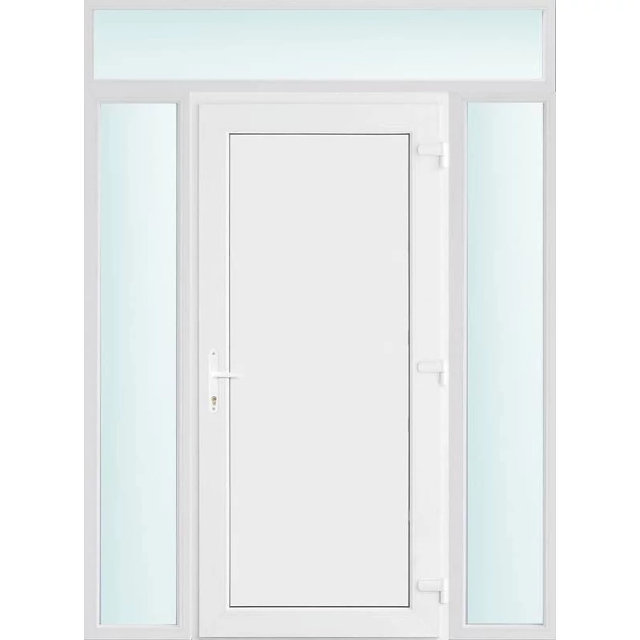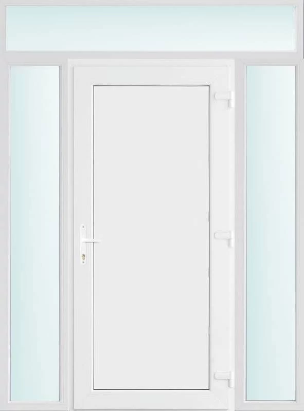 Kiváló hőszigetelésű műanyag bejárati ajtó 5 kamrás profilból, 70 mm beépítési mélységgel, tokban körbefutó idomacél merevítéssel. Vasalat: kilincsműködtetésű, VORNE 5 pontos ajtózárral, 3 db 3D erősített ajtópánttal, 20mm magas hőhídmentes alumínium küszöbbel. Dupla szürke ütközőtömítéssel rendelkezik. Üvegezése "SAVMART" katedrál 2 rétegű Szuperlágybevonatos thermo üveg, 24 mm vastagságban, UG értéke: 1.0 W/m2K . A bejárati ajtó mindkét oldalán fehér színű. Nyitásmódja befelé nyíló, nyitásiránya jobbos ( bentről nézve a zsanér a jobb oldalon helyezkedik el ). Tényleges tokkülmérete: 158 cm széles 238 cm magas. 98 cm széles 208 cm magas bejárati ajtóból, és 2 darab 30 cm széles 208 cm magas fix "SAVMART" üvegezésű ( nem nyitható) oldalvilágítóból és egy 158 cm széles 30 cm magas fix "SAVMART" üvegezésű ( nem nyitható) felülvilágítóból áll. ( négy külön elem ami beépítéskor összeszerelendő). A nyílászáró ára nem tartalmazza a KILINCSET és a ZÁRBETÉTET a beszereléshez szükséges segédanyagokat (falkampó, csavar, pur-hab..stb.), külső-belső takaróléceket.