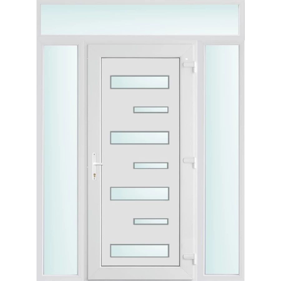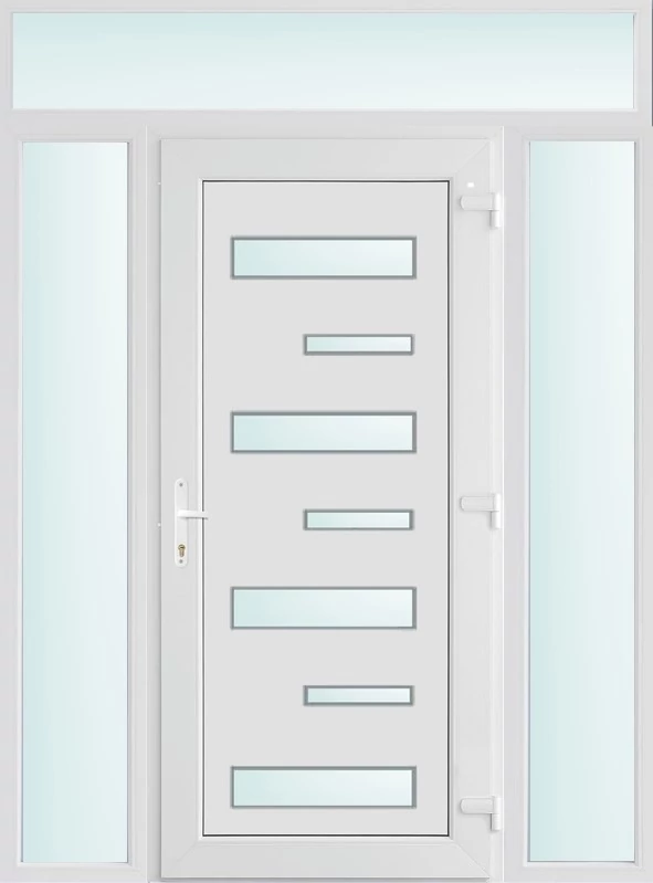 Kiváló hőszigetelésű műanyag bejárati ajtó 5 kamrás profilból, 70 mm beépítési mélységgel, tokban körbefutó idomacél merevítéssel. Vasalat: kilincsműködtetésű, VORNE 5 pontos ajtózárral, 3 db 3D erősített ajtópánttal, 20mm magas hőhídmentes alumínium küszöbbel. Dupla szürke ütközőtömítéssel rendelkezik. Üvegezése "SAVMART" katedrál 2 rétegű Szuperlágybevonatos thermo üveg, 24 mm vastagságban, UG értéke: 1.0 W/m2K . A bejárati ajtó mindkét oldalán fehér színű. Nyitásmódja befelé nyíló, nyitásiránya jobbos ( bentről nézve a zsanér a jobb oldalon helyezkedik el ). Tényleges tokkülmérete: 158 cm széles 238 cm magas. 98 cm széles 208 cm magas bejárati ajtóból, és 2 darab 30 cm széles 208 cm magas fix "SAVMART" üvegezésű ( nem nyitható) oldalvilágítóból és egy 158 cm széles 30 cm magas fix "SAVMART" üvegezésű ( nem nyitható) felülvilágítóból áll. ( négy külön elem ami beépítéskor összeszerelendő). A nyílászáró ára nem tartalmazza a KILINCSET és a ZÁRBETÉTET a beszereléshez szükséges segédanyagokat (falkampó, csavar, pur-hab..stb.), külső-belső takaróléceket.