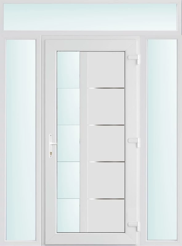 Kiváló hőszigetelésű műanyag bejárati ajtó 5 kamrás profilból, 70 mm beépítési mélységgel, tokban körbefutó idomacél merevítéssel. Vasalat: kilincsműködtetésű, VORNE 5 pontos ajtózárral, 3 db 3D erősített ajtópánttal, 20mm magas hőhídmentes alumínium küszöbbel. Dupla szürke ütközőtömítéssel rendelkezik. Üvegezése "SAVMART" katedrál 2 rétegű Szuperlágybevonatos thermo üveg, 24 mm vastagságban, UG értéke: 1.0 W/m2K . A bejárati ajtó mindkét oldalán fehér színű. Nyitásmódja befelé nyíló, nyitásiránya jobbos ( bentről nézve a zsanér a jobb oldalon helyezkedik el ). Tényleges tokkülmérete: 158 cm széles 238 cm magas. 98 cm széles 208 cm magas bejárati ajtóból, és 2 darab 30 cm széles 208 cm magas fix "SAVMART" üvegezésű ( nem nyitható) oldalvilágítóból és egy 158 cm széles 30 cm magas fix "SAVMART" üvegezésű ( nem nyitható) felülvilágítóból áll. ( négy külön elem ami beépítéskor összeszerelendő). A nyílászáró ára nem tartalmazza a KILINCSET és a ZÁRBETÉTET a beszereléshez szükséges segédanyagokat (falkampó, csavar, pur-hab..stb.), külső-belső takaróléceket.
