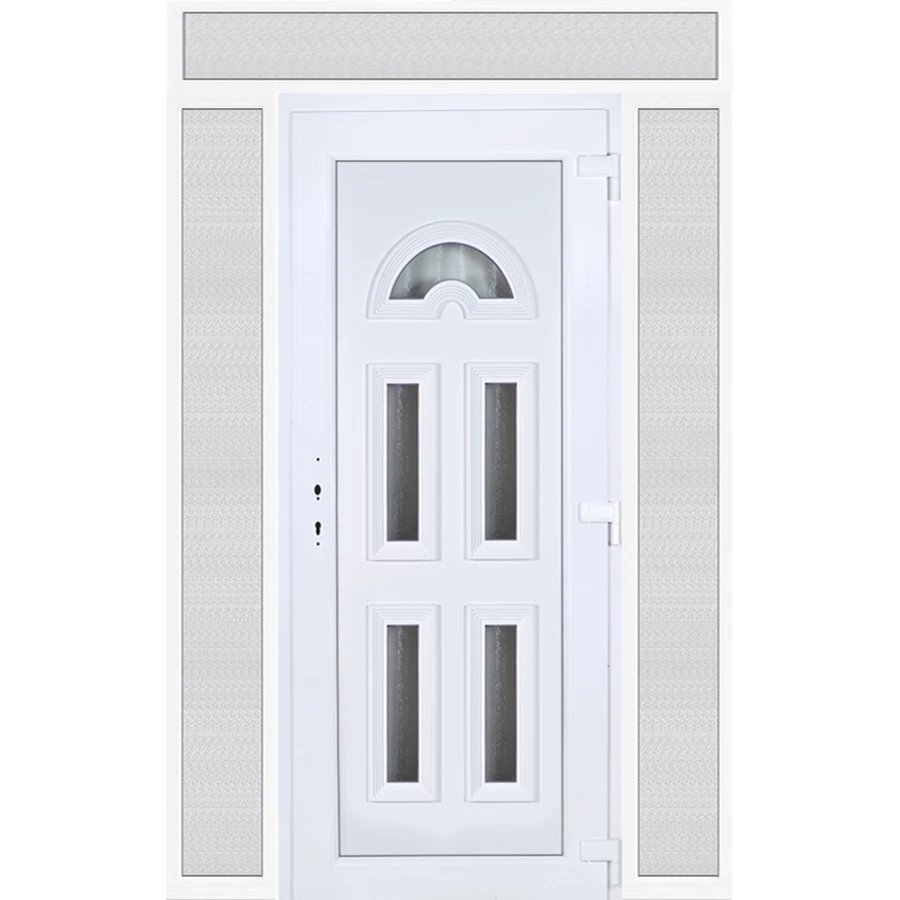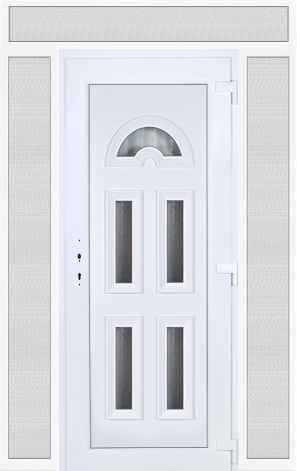 EXTRA hőszigetelésű műanyag bejárati ajtó 5 kamrás profilból, 70 mm beépítési mélységgel, tokban körbefutó idomacél merevítéssel. Vasalat: kilincsműködtetésű, 5 pontos ajtózárral, 3 db 3D erősített ajtópánttal, 20mm magas hőhídmentes alumínium küszöbbel, + 20mm purenittel a küszöb alatt. Dupla szürke ütközőtömítéssel rendelkezik. Üvegezése "savmart" katedrál 3 RÉTEGŰ Szuperlágybevonatos thermo üveg, 42 mm vastagságban, UG értéke: 0,7 W/m2K . A bejárati ajtó mindkét oldalán fehér színű. Nyitásmódja befelé nyíló, nyitásiránya jobbos ( bentről nézve a zsanér a jobb oldalon helyezkedik el ). Tényleges tokkülmérete: 158 cm széles 239 cm magas. 98 cm széles 209 cm magas bejárati ajtóból, és 2 darab 30 cm széles 209 cm magas fix "savmart" üvegezésű ( nem nyitható) oldalvilágítóból és egy 158 cm széles 30 cm magas fix "savmart" üvegezésű ( nem nyitható) felülvilágítóból áll. ( négy külön elem ami beépítéskor összeszerelendő). A nyílászáró ára nem tartalmazza a KILINCSET és a ZÁRBETÉTET a beszereléshez szükséges segédanyagokat (falkampó, csavar, pur-hab..stb.), külső-belső takaróléceket.