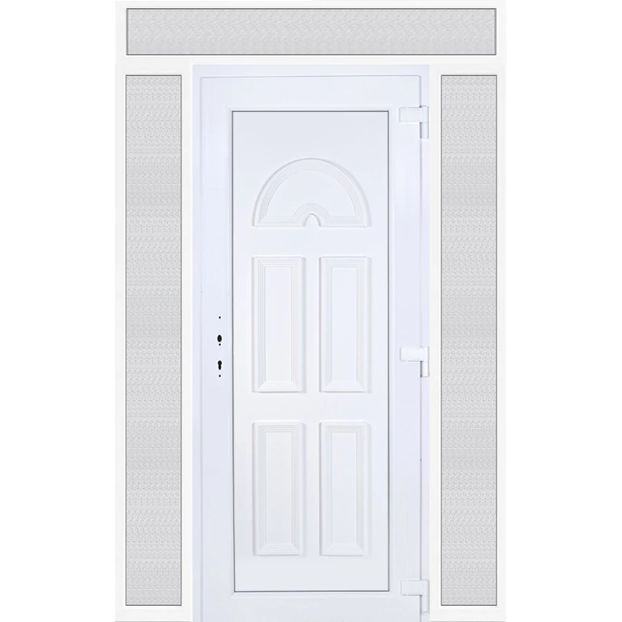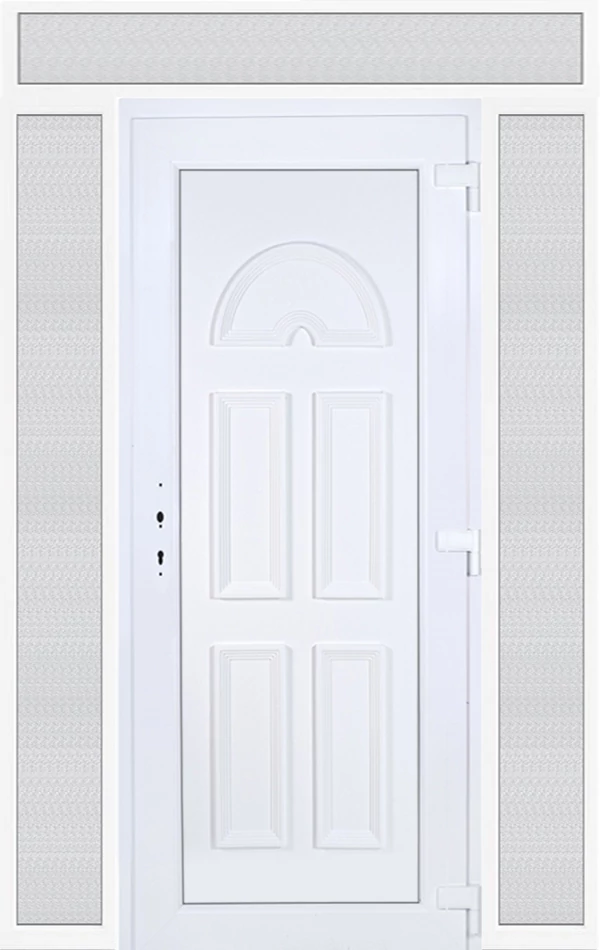 EXTRA hőszigetelésű műanyag bejárati ajtó 5 kamrás profilból, 70 mm beépítési mélységgel, tokban körbefutó idomacél merevítéssel. Vasalat: kilincsműködtetésű, 5 pontos ajtózárral, 3 db 3D erősített ajtópánttal, 20mm magas hőhídmentes alumínium küszöbbel, + 20mm purenittel a küszöb alatt. Dupla szürke ütközőtömítéssel rendelkezik. Üvegezése "savmart" katedrál 3 RÉTEGŰ Szuperlágybevonatos thermo üveg, 42 mm vastagságban, UG értéke: 0,7 W/m2K . A bejárati ajtó mindkét oldalán fehér színű. Nyitásmódja befelé nyíló, nyitásiránya jobbos ( bentről nézve a zsanér a jobb oldalon helyezkedik el ). Tényleges tokkülmérete: 158 cm széles 239 cm magas. 98 cm széles 209 cm magas bejárati ajtóból, és 2 darab 30 cm széles 209 cm magas fix "savmart" üvegezésű ( nem nyitható) oldalvilágítóból és egy 158 cm széles 30 cm magas fix "savmart" üvegezésű ( nem nyitható) felülvilágítóból áll. ( négy külön elem ami beépítéskor összeszerelendő). A nyílászáró ára nem tartalmazza a KILINCSET és a ZÁRBETÉTET a beszereléshez szükséges segédanyagokat (falkampó, csavar, pur-hab..stb.), külső-belső takaróléceket.