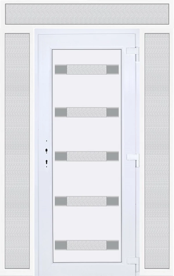EXTRA hőszigetelésű műanyag bejárati ajtó 5 kamrás profilból, 70 mm beépítési mélységgel, tokban körbefutó idomacél merevítéssel. Vasalat: kilincsműködtetésű, 5 pontos ajtózárral, 3 db 3D erősített ajtópánttal, 20mm magas hőhídmentes alumínium küszöbbel, + 20mm purenittel a küszöb alatt. Dupla szürke ütközőtömítéssel rendelkezik. Üvegezése "savmart" katedrál 3 RÉTEGŰ Szuperlágybevonatos thermo üveg, 42 mm vastagságban, UG értéke: 0,7 W/m2K . A bejárati ajtó mindkét oldalán fehér színű. Nyitásmódja befelé nyíló, nyitásiránya jobbos ( bentről nézve a zsanér a jobb oldalon helyezkedik el ). Tényleges tokkülmérete: 158 cm széles 239 cm magas. 98 cm széles 209 cm magas bejárati ajtóból, és 2 darab 30 cm széles 209 cm magas fix "savmart" üvegezésű ( nem nyitható) oldalvilágítóból és egy 158 cm széles 30 cm magas fix "savmart" üvegezésű ( nem nyitható) felülvilágítóból áll. ( négy külön elem ami beépítéskor összeszerelendő). A nyílászáró ára nem tartalmazza a KILINCSET és a ZÁRBETÉTET a beszereléshez szükséges segédanyagokat (falkampó, csavar, pur-hab..stb.), külső-belső takaróléceket.
