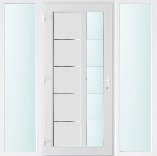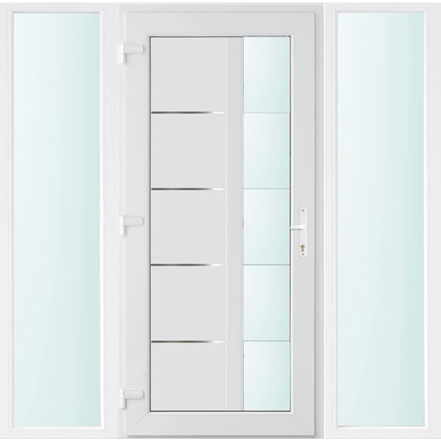 Kiváló hőszigetelésű műanyag bejárati ajtó 5 kamrás profilból, 70 mm beépítési mélységgel, tokban körbefutó idomacél merevítéssel. Vasalat: kilincsműködtetésű, VORNE 5 pontos ajtózárral, 3 db 3D erősített ajtópánttal, 20mm magas hőhídmentes alumínium küszöbbel. Dupla szürke ütközőtömítéssel rendelkezik. Üvegezése "SAVMART" katedrál 2 rétegű Szuperlágybevonatos thermo üveg, 24 mm vastagságban, UG értéke: 1.0 W/m2K . A bejárati ajtó mindkét oldalán fehér színű. Nyitásmódja befelé nyíló, nyitásiránya balos ( bentről nézve a zsanér a bal oldalon helyezkedik el ). Tényleges tokkülmérete: 178 cm széles 208 cm magas. 98 cm széles 208 cm magas bejárati ajtóból, és 2 darab 40 cm széles 208 cm magas fix "SAVMART" üvegezésű ( nem nyitható) oldalvilágítóból áll. ( 3 külön elem ami beépítéskor összeszerelendő). A nyílászáró ára nem tartalmazza a KILINCSET és a ZÁRBETÉTET a beszereléshez szükséges segédanyagokat (falkampó, csavar, pur-hab..stb.), külső-belső takaróléceket.