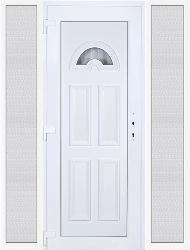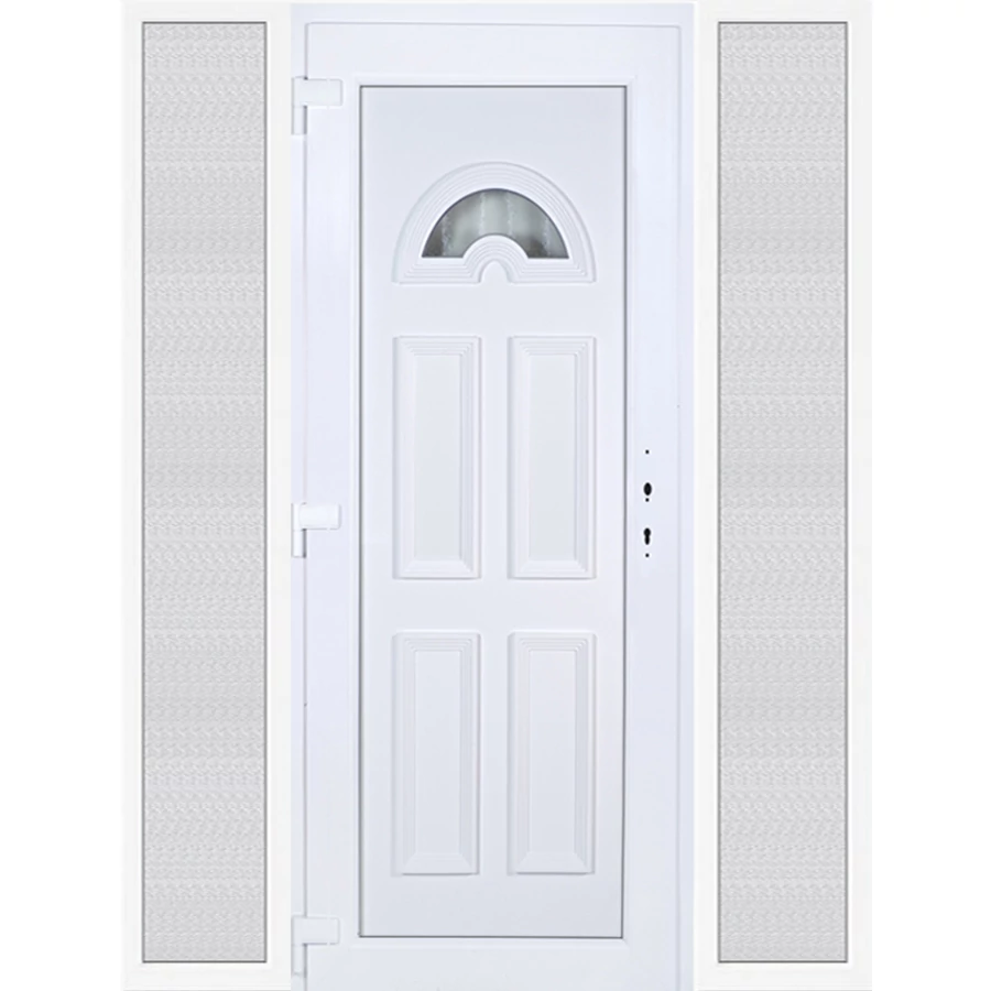 Kiváló hőszigetelésű műanyag bejárati ajtó 5 kamrás profilból, 70 mm beépítési mélységgel, tokban körbefutó idomacél merevítéssel. Vasalat: kilincsműködtetésű, 5 pontos ajtózárral, 3 db 3D erősített ajtópánttal, 35mm magas hőhídmentes alumínium küszöbbel. Dupla szürke ütközőtömítéssel rendelkezik. Üvegezése "GRÍZ" katedrál 2 rétegű Szuperlágybevonatos thermo üveg, 24 mm vastagságban, UG értéke: 1.0 W/m2K . A bejárati ajtó mindkét oldalán fehér színű. Nyitásmódja befelé nyíló, nyitásiránya balos ( bentről nézve a zsanér a bal oldalon helyezkedik el ). Tényleges tokkülmérete: 178 cm széles 208,5 cm magas. 98 cm széles 208,5 cm magas bejárati ajtóból, és 2 darab 40 cm széles 208,5 cm magas fix "GRÍZ" üvegezésű ( nem nyitható) oldalvilágítóból áll. ( 3 külön elem ami beépítéskor összeszerelendő). A nyílászáró ára nem tartalmazza a KILINCSET és a ZÁRBETÉTET a beszereléshez szükséges segédanyagokat (falkampó, csavar, pur-hab..stb.), külső-belső takaróléceket.