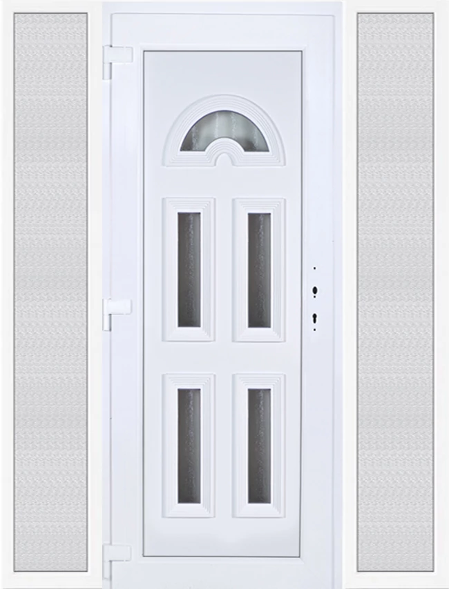Kiváló hőszigetelésű műanyag bejárati ajtó 5 kamrás profilból, 70 mm beépítési mélységgel, tokban körbefutó idomacél merevítéssel. Vasalat: kilincsműködtetésű, 5 pontos ajtózárral, 3 db 3D erősített ajtópánttal, 35mm magas hőhídmentes alumínium küszöbbel. Dupla szürke ütközőtömítéssel rendelkezik. Üvegezése "GRÍZ" katedrál 2 rétegű Szuperlágybevonatos thermo üveg, 24 mm vastagságban, UG értéke: 1.0 W/m2K . A bejárati ajtó mindkét oldalán fehér színű. Nyitásmódja befelé nyíló, nyitásiránya balos ( bentről nézve a zsanér a bal oldalon helyezkedik el ). Tényleges tokkülmérete: 178 cm széles 208,5 cm magas. 98 cm széles 208,5 cm magas bejárati ajtóból, és 2 darab 40 cm széles 208,5 cm magas fix "GRÍZ" üvegezésű ( nem nyitható) oldalvilágítóból áll. ( 3 külön elem ami beépítéskor összeszerelendő). A nyílászáró ára nem tartalmazza a KILINCSET és a ZÁRBETÉTET a beszereléshez szükséges segédanyagokat (falkampó, csavar, pur-hab..stb.), külső-belső takaróléceket.