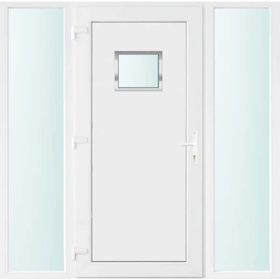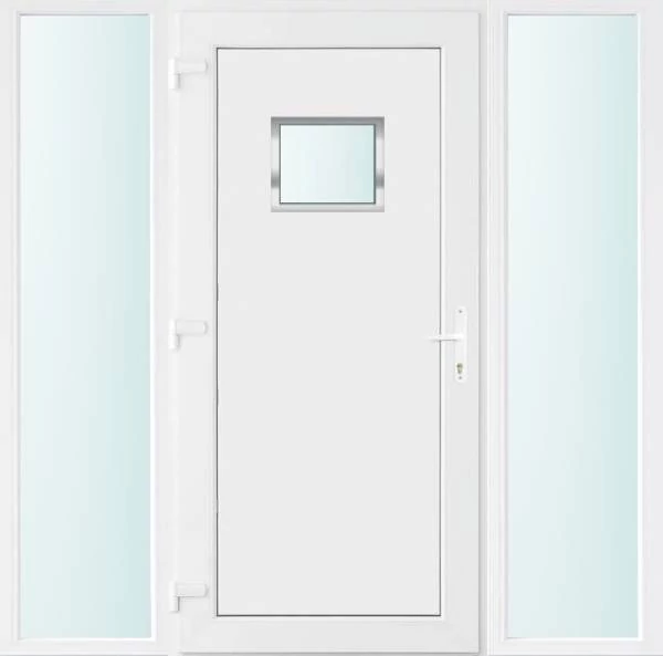 Kiváló hőszigetelésű műanyag bejárati ajtó 5 kamrás profilból, 70 mm beépítési mélységgel, tokban körbefutó idomacél merevítéssel. Vasalat: kilincsműködtetésű, VORNE 5 pontos ajtózárral, 3 db 3D erősített ajtópánttal, 20mm magas hőhídmentes alumínium küszöbbel. Dupla szürke ütközőtömítéssel rendelkezik. Üvegezése "SAVMART" katedrál 2 rétegű Szuperlágybevonatos thermo üveg, 24 mm vastagságban, UG értéke: 1.0 W/m2K . A bejárati ajtó mindkét oldalán fehér színű. Nyitásmódja befelé nyíló, nyitásiránya balos ( bentről nézve a zsanér a bal oldalon helyezkedik el ). Tényleges tokkülmérete: 178 cm széles 208 cm magas. 98 cm széles 208 cm magas bejárati ajtóból, és 2 darab 40 cm széles 208 cm magas fix "SAVMART" üvegezésű ( nem nyitható) oldalvilágítóból áll. ( 3 külön elem ami beépítéskor összeszerelendő). A nyílászáró ára nem tartalmazza a KILINCSET és a ZÁRBETÉTET a beszereléshez szükséges segédanyagokat (falkampó, csavar, pur-hab..stb.), külső-belső takaróléceket.