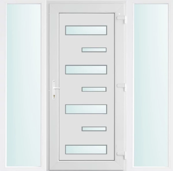EXTRA hőszigetelésű műanyag bejárati ajtó 5 kamrás profilból, 70 mm beépítési mélységgel, tokban körbefutó idomacél merevítéssel. Vasalat: kilincsműködtetésű, 5 pontos ajtózárral, 3 db 3D erősített ajtópánttal, 20mm magas hőhídmentes alumínium küszöbbel, + 20mm purenittel a küszöb alatt. Dupla szürke ütközőtömítéssel rendelkezik. Üvegezése "savmart" katedrál 3 RÉTEGŰ Szuperlágybevonatos thermo üveg, 42 mm vastagságban, UG értéke: 0,7 W/m2K . A bejárati ajtó mindkét oldalán fehér színű. Nyitásmódja befelé nyíló, nyitásiránya jobbos ( bentről nézve a zsanér a jobb oldalon helyezkedik el ). Tényleges tokkülmérete: 178 cm széles 209 cm magas. 98 cm széles 209 cm magas bejárati ajtóból, és 2 darab 40 cm széles 209 cm magas fix "savmart" üvegezésű ( nem nyitható) oldalvilágítóból áll. ( 3 külön elem ami beépítéskor összeszerelendő). A nyílászáró ára nem tartalmazza a KILINCSET és a ZÁRBETÉTET a beszereléshez szükséges segédanyagokat (falkampó, csavar, pur-hab..stb.), külső-belső takaróléceket.