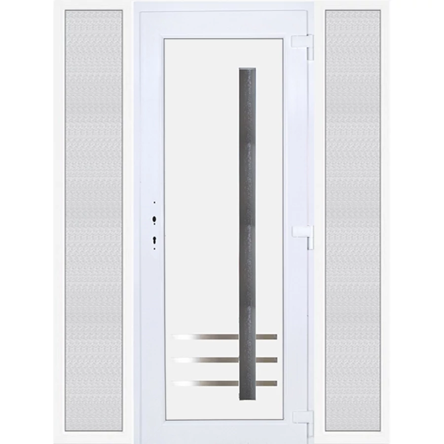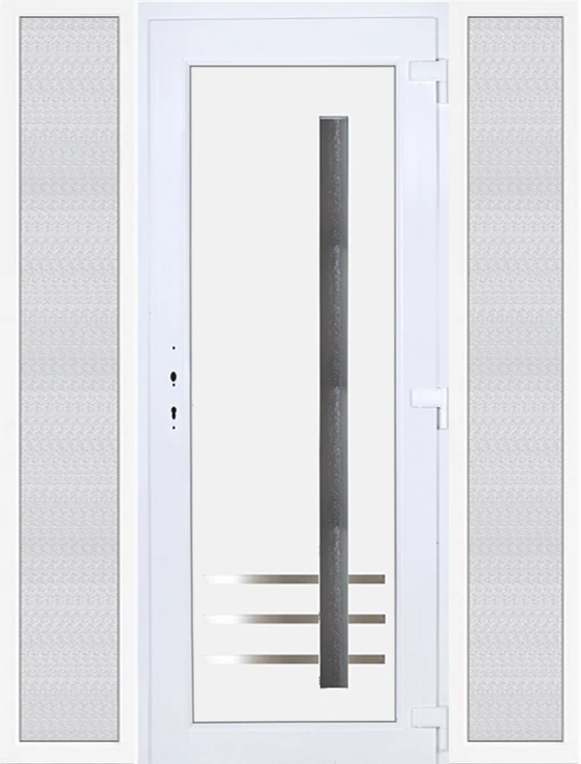 EXTRA hőszigetelésű műanyag bejárati ajtó 5 kamrás profilból, 70 mm beépítési mélységgel, tokban körbefutó idomacél merevítéssel. Vasalat: kilincsműködtetésű, 5 pontos ajtózárral, 3 db 3D erősített ajtópánttal, 20mm magas hőhídmentes alumínium küszöbbel, + 20mm purenittel a küszöb alatt. Dupla szürke ütközőtömítéssel rendelkezik. Üvegezése "savmart" katedrál 3 RÉTEGŰ Szuperlágybevonatos thermo üveg, 42 mm vastagságban, UG értéke: 0,7 W/m2K . A bejárati ajtó mindkét oldalán fehér színű. Nyitásmódja befelé nyíló, nyitásiránya jobbos ( bentről nézve a zsanér a jobb oldalon helyezkedik el ). Tényleges tokkülmérete: 178 cm széles 209 cm magas. 98 cm széles 209 cm magas bejárati ajtóból, és 2 darab 40 cm széles 209 cm magas fix "savmart" üvegezésű ( nem nyitható) oldalvilágítóból áll. ( 3 külön elem ami beépítéskor összeszerelendő). A nyílászáró ára nem tartalmazza a KILINCSET és a ZÁRBETÉTET a beszereléshez szükséges segédanyagokat (falkampó, csavar, pur-hab..stb.), külső-belső takaróléceket.