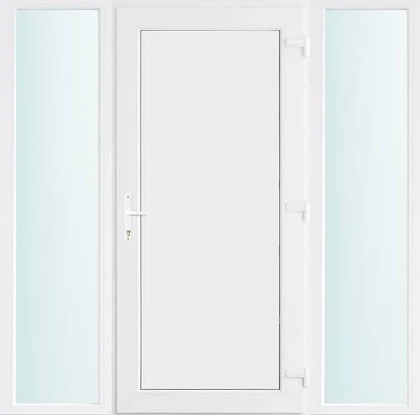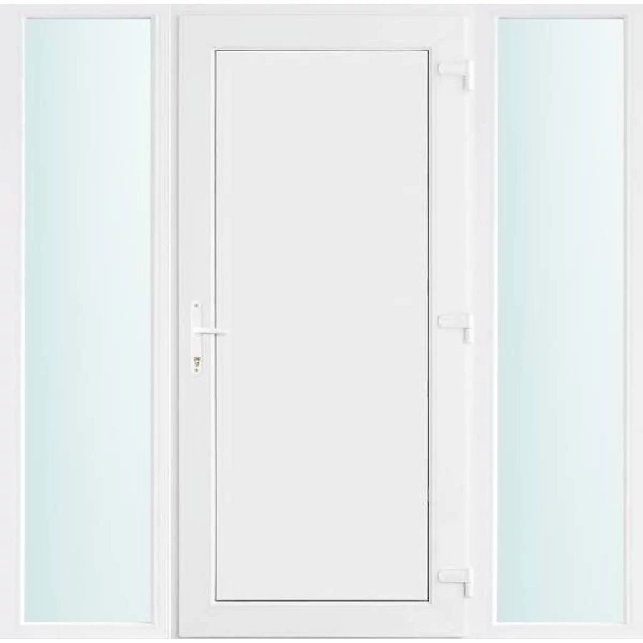 Kiváló hőszigetelésű műanyag bejárati ajtó 5 kamrás profilból, 70 mm beépítési mélységgel, tokban körbefutó idomacél merevítéssel. Vasalat: kilincsműködtetésű, VORNE 5 pontos ajtózárral, 3 db 3D erősített ajtópánttal, 20mm magas hőhídmentes alumínium küszöbbel. Dupla szürke ütközőtömítéssel rendelkezik. Üvegezése "SAVMART" katedrál 2 rétegű Szuperlágybevonatos thermo üveg, 24 mm vastagságban, UG értéke: 1.0 W/m2K . A bejárati ajtó mindkét oldalán fehér színű. Nyitásmódja befelé nyíló, nyitásiránya jobbos ( bentről nézve a zsanér a jobb oldalon helyezkedik el ). Tényleges tokkülmérete: 178 cm széles 208 cm magas. 98 cm széles 208 cm magas bejárati ajtóból, és 2 darab 40 cm széles 208 cm magas fix "SAVMART" üvegezésű ( nem nyitható) oldalvilágítóból áll. ( 3 külön elem ami beépítéskor összeszerelendő). A nyílászáró ára nem tartalmazza a KILINCSET és a ZÁRBETÉTET a beszereléshez szükséges segédanyagokat (falkampó, csavar, pur-hab..stb.), külső-belső takaróléceket.