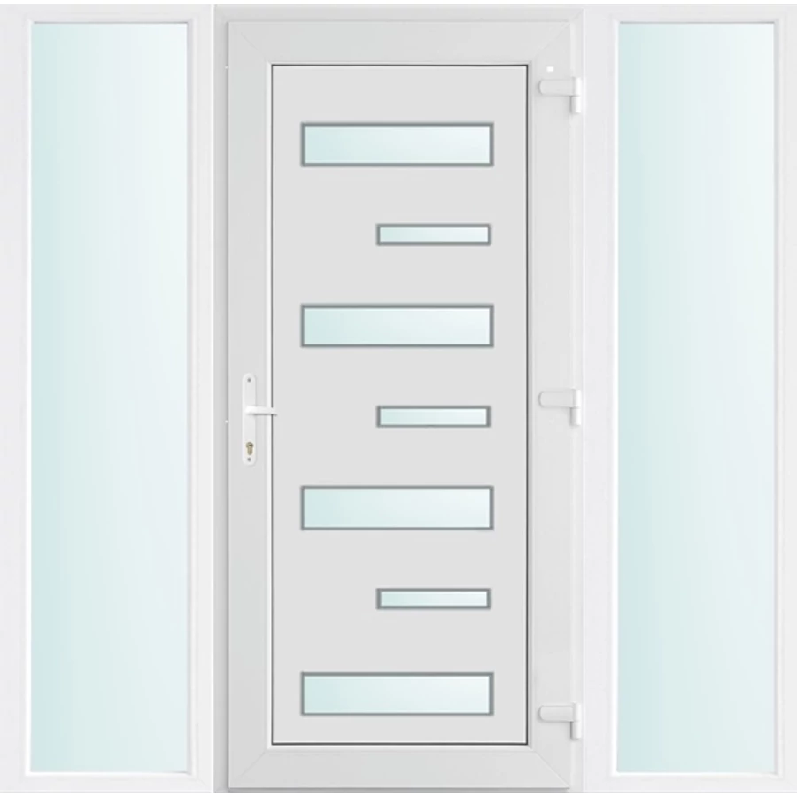 Kiváló hőszigetelésű műanyag bejárati ajtó 5 kamrás profilból, 70 mm beépítési mélységgel, tokban körbefutó idomacél merevítéssel. Vasalat: kilincsműködtetésű, VORNE 5 pontos ajtózárral, 3 db 3D erősített ajtópánttal, 20mm magas hőhídmentes alumínium küszöbbel. Dupla szürke ütközőtömítéssel rendelkezik. Üvegezése "SAVMART" katedrál 2 rétegű Szuperlágybevonatos thermo üveg, 24 mm vastagságban, UG értéke: 1.0 W/m2K . A bejárati ajtó mindkét oldalán fehér színű. Nyitásmódja befelé nyíló, nyitásiránya jobbos ( bentről nézve a zsanér a jobb oldalon helyezkedik el ). Tényleges tokkülmérete: 178 cm széles 208 cm magas. 98 cm széles 208 cm magas bejárati ajtóból, és 2 darab 40 cm széles 208 cm magas fix "SAVMART" üvegezésű ( nem nyitható) oldalvilágítóból áll. ( 3 külön elem ami beépítéskor összeszerelendő). A nyílászáró ára nem tartalmazza a KILINCSET és a ZÁRBETÉTET a beszereléshez szükséges segédanyagokat (falkampó, csavar, pur-hab..stb.), külső-belső takaróléceket.