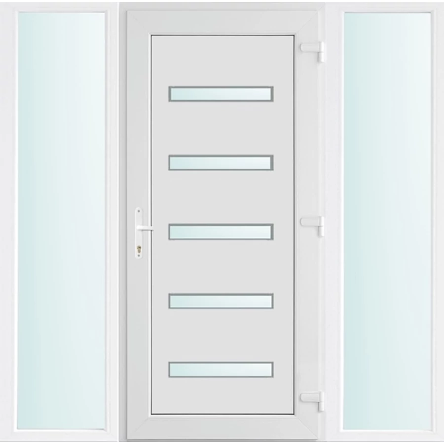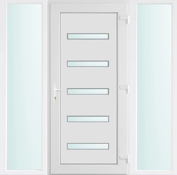 Kiváló hőszigetelésű műanyag bejárati ajtó 5 kamrás profilból, 70 mm beépítési mélységgel, tokban körbefutó idomacél merevítéssel. Vasalat: kilincsműködtetésű, VORNE 5 pontos ajtózárral, 3 db 3D erősített ajtópánttal, 20mm magas hőhídmentes alumínium küszöbbel. Dupla szürke ütközőtömítéssel rendelkezik. Üvegezése "SAVMART" katedrál 2 rétegű Szuperlágybevonatos thermo üveg, 24 mm vastagságban, UG értéke: 1.0 W/m2K . A bejárati ajtó mindkét oldalán fehér színű. Nyitásmódja befelé nyíló, nyitásiránya jobbos ( bentről nézve a zsanér a jobb oldalon helyezkedik el ). Tényleges tokkülmérete: 178 cm széles 208 cm magas. 98 cm széles 208 cm magas bejárati ajtóból, és 2 darab 40 cm széles 208 cm magas fix "SAVMART" üvegezésű ( nem nyitható) oldalvilágítóból áll. ( 3 külön elem ami beépítéskor összeszerelendő). A nyílászáró ára nem tartalmazza a KILINCSET és a ZÁRBETÉTET a beszereléshez szükséges segédanyagokat (falkampó, csavar, pur-hab..stb.), külső-belső takaróléceket.