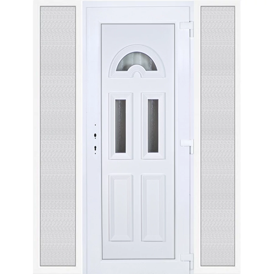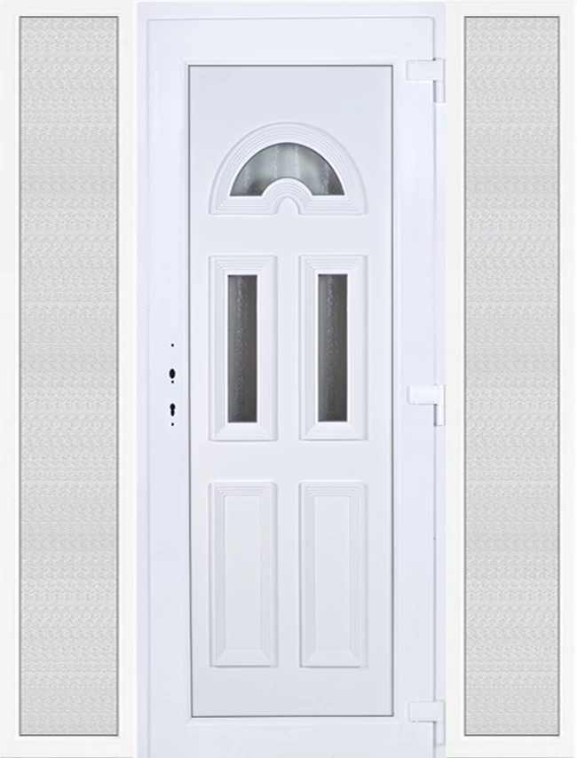 EXTRA hőszigetelésű műanyag bejárati ajtó 5 kamrás profilból, 70 mm beépítési mélységgel, tokban körbefutó idomacél merevítéssel. Vasalat: kilincsműködtetésű, 5 pontos ajtózárral, 3 db 3D erősített ajtópánttal, 20mm magas hőhídmentes alumínium küszöbbel, + 20mm purenittel a küszöb alatt. Dupla szürke ütközőtömítéssel rendelkezik. Üvegezése "savmart" katedrál 3 RÉTEGŰ Szuperlágybevonatos thermo üveg, 42 mm vastagságban, UG értéke: 0,7 W/m2K . A bejárati ajtó mindkét oldalán fehér színű. Nyitásmódja befelé nyíló, nyitásiránya jobbos ( bentről nézve a zsanér a jobb oldalon helyezkedik el ). Tényleges tokkülmérete: 178 cm széles 209 cm magas. 98 cm széles 209 cm magas bejárati ajtóból, és 2 darab 40 cm széles 209 cm magas fix "savmart" üvegezésű ( nem nyitható) oldalvilágítóból áll. ( 3 külön elem ami beépítéskor összeszerelendő). A nyílászáró ára nem tartalmazza a KILINCSET és a ZÁRBETÉTET a beszereléshez szükséges segédanyagokat (falkampó, csavar, pur-hab..stb.), külső-belső takaróléceket.