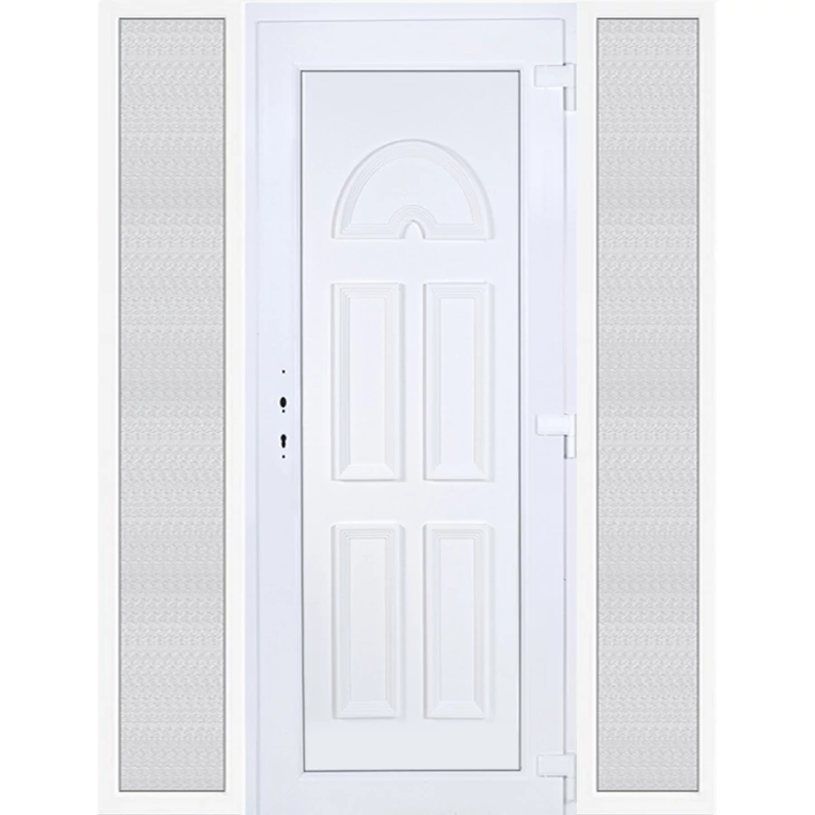 Kiváló hőszigetelésű műanyag bejárati ajtó 5 kamrás profilból, 70 mm beépítési mélységgel, tokban körbefutó idomacél merevítéssel. Vasalat: kilincsműködtetésű, 5 pontos ajtózárral, 3 db 3D erősített ajtópánttal, 35mm magas hőhídmentes alumínium küszöbbel. Dupla szürke ütközőtömítéssel rendelkezik. Üvegezése "GRÍZ" katedrál 2 rétegű Szuperlágybevonatos thermo üveg, 24 mm vastagságban, UG értéke: 1.0 W/m2K . A bejárati ajtó mindkét oldalán fehér színű. Nyitásmódja befelé nyíló, nyitásiránya jobbos ( bentről nézve a zsanér a jobb oldalon helyezkedik el ). Tényleges tokkülmérete: 178 cm széles 208,5 cm magas. 98 cm széles 208,5 cm magas bejárati ajtóból, és 2 darab 40 cm széles 208,5 cm magas fix "GRÍZ" üvegezésű ( nem nyitható) oldalvilágítóból áll. ( 3 külön elem ami beépítéskor összeszerelendő). A nyílászáró ára nem tartalmazza a KILINCSET és a ZÁRBETÉTET a beszereléshez szükséges segédanyagokat (falkampó, csavar, pur-hab..stb.), külső-belső takaróléceket.
