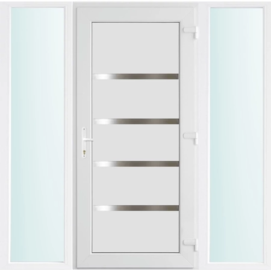 Kiváló hőszigetelésű műanyag bejárati ajtó 5 kamrás profilból, 70 mm beépítési mélységgel, tokban körbefutó idomacél merevítéssel. Vasalat: kilincsműködtetésű, VORNE 5 pontos ajtózárral, 3 db 3D erősített ajtópánttal, 20mm magas hőhídmentes alumínium küszöbbel. Dupla szürke ütközőtömítéssel rendelkezik. Üvegezése "SAVMART" katedrál 2 rétegű Szuperlágybevonatos thermo üveg, 24 mm vastagságban, UG értéke: 1.0 W/m2K . A bejárati ajtó mindkét oldalán fehér színű. Nyitásmódja befelé nyíló, nyitásiránya jobbos ( bentről nézve a zsanér a jobb oldalon helyezkedik el ). Tényleges tokkülmérete: 178 cm széles 208 cm magas. 98 cm széles 208 cm magas bejárati ajtóból, és 2 darab 40 cm széles 208 cm magas fix "SAVMART" üvegezésű ( nem nyitható) oldalvilágítóból áll. ( 3 külön elem ami beépítéskor összeszerelendő). A nyílászáró ára nem tartalmazza a KILINCSET és a ZÁRBETÉTET a beszereléshez szükséges segédanyagokat (falkampó, csavar, pur-hab..stb.), külső-belső takaróléceket.