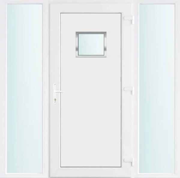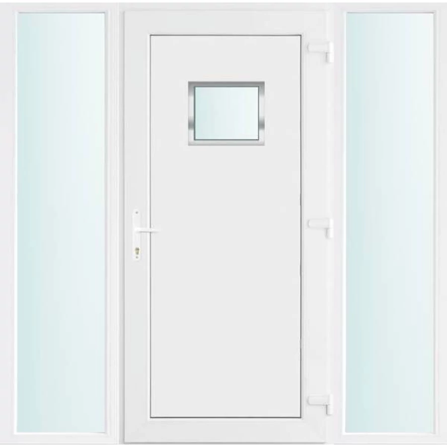 Kiváló hőszigetelésű műanyag bejárati ajtó 5 kamrás profilból, 70 mm beépítési mélységgel, tokban körbefutó idomacél merevítéssel. Vasalat: kilincsműködtetésű, VORNE 5 pontos ajtózárral, 3 db 3D erősített ajtópánttal, 20mm magas hőhídmentes alumínium küszöbbel. Dupla szürke ütközőtömítéssel rendelkezik. Üvegezése "SAVMART" katedrál 2 rétegű Szuperlágybevonatos thermo üveg, 24 mm vastagságban, UG értéke: 1.0 W/m2K . A bejárati ajtó mindkét oldalán fehér színű. Nyitásmódja befelé nyíló, nyitásiránya jobbos ( bentről nézve a zsanér a jobb oldalon helyezkedik el ). Tényleges tokkülmérete: 178 cm széles 208 cm magas. 98 cm széles 208 cm magas bejárati ajtóból, és 2 darab 40 cm széles 208 cm magas fix "SAVMART" üvegezésű ( nem nyitható) oldalvilágítóból áll. ( 3 külön elem ami beépítéskor összeszerelendő). A nyílászáró ára nem tartalmazza a KILINCSET és a ZÁRBETÉTET a beszereléshez szükséges segédanyagokat (falkampó, csavar, pur-hab..stb.), külső-belső takaróléceket.