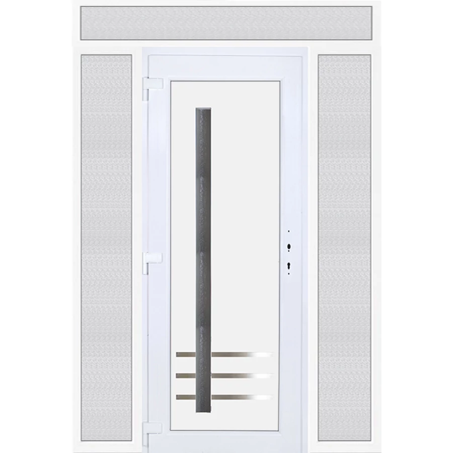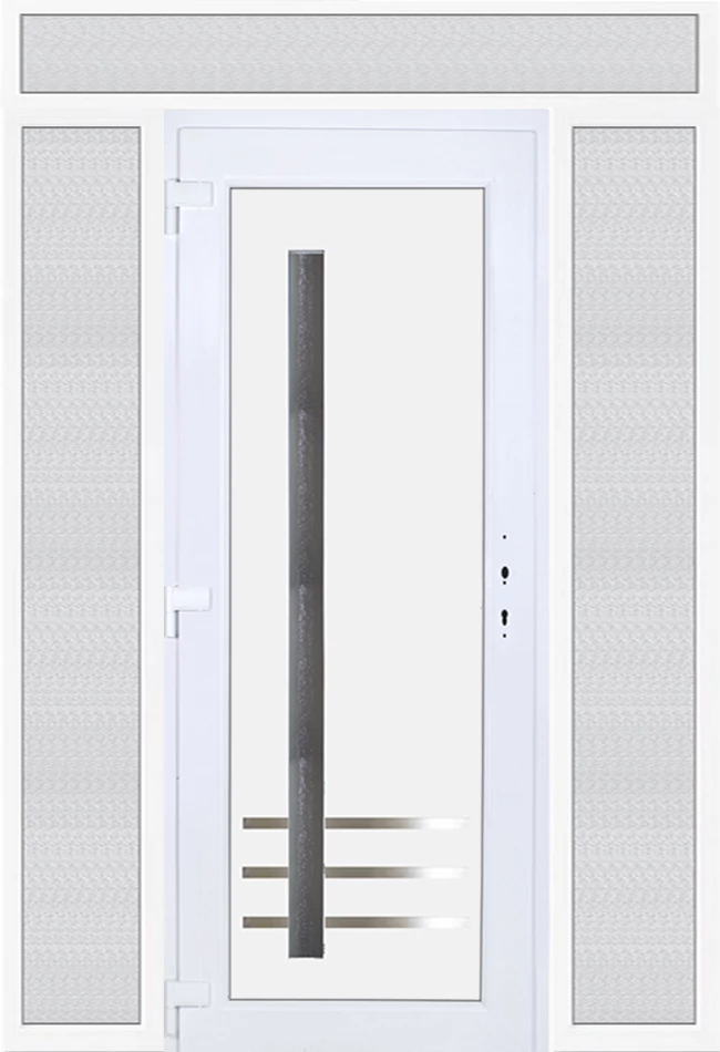 Kiváló hőszigetelésű műanyag bejárati ajtó 5 kamrás profilból, 70 mm beépítési mélységgel, tokban körbefutó idomacél merevítéssel. Vasalat: kilincsműködtetésű, 5 pontos ajtózárral, 3 db 3D erősített ajtópánttal, 35mm magas hőhídmentes alumínium küszöbbel. Dupla szürke ütközőtömítéssel rendelkezik. Üvegezése "GRÍZ" katedrál 2 rétegű Szuperlágybevonatos thermo üveg, 24 mm vastagságban, UG értéke: 1.0 W/m2K . A bejárati ajtó mindkét oldalán fehér színű. Nyitásmódja befelé nyíló, nyitásiránya balos ( bentről nézve a zsanér a bal oldalon helyezkedik el ). Tényleges tokkülmérete: 178 cm széles 238,5 cm magas. 98 cm széles 208,5 cm magas bejárati ajtóból, és 2 darab 40 cm széles 208,5 cm magas fix "GRÍZ" üvegezésű ( nem nyitható) oldalvilágítóból és egy 178 cm széles 30 cm magas fix "GRÍZ" üvegezésű ( nem nyitható) felülvilágítóból áll. ( négy külön elem ami beépítéskor összeszerelendő). A nyílászáró ára nem tartalmazza a KILINCSET és a ZÁRBETÉTET a beszereléshez szükséges segédanyagokat (falkampó, csavar, pur-hab..stb.), külső-belső takaróléceket.