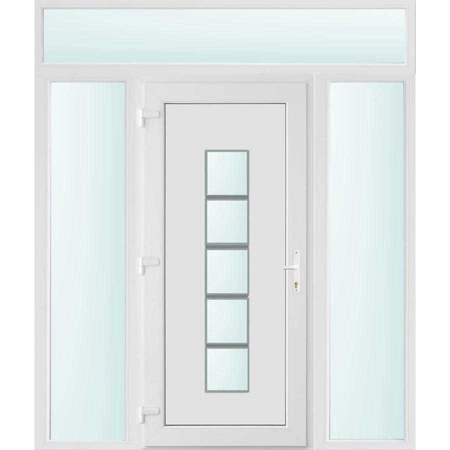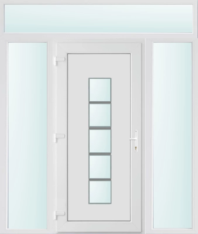 Kiváló hőszigetelésű műanyag bejárati ajtó 5 kamrás profilból, 70 mm beépítési mélységgel, tokban körbefutó idomacél merevítéssel. Vasalat: kilincsműködtetésű, VORNE 5 pontos ajtózárral, 3 db 3D erősített ajtópánttal, 20mm magas hőhídmentes alumínium küszöbbel. Dupla szürke ütközőtömítéssel rendelkezik. Üvegezése "SAVMART" katedrál 2 rétegű Szuperlágybevonatos thermo üveg, 24 mm vastagságban, UG értéke: 1.0 W/m2K . A bejárati ajtó mindkét oldalán fehér színű. Nyitásmódja befelé nyíló, nyitásiránya balos ( bentről nézve a zsanér a bal oldalon helyezkedik el ). Tényleges tokkülmérete: 178 cm széles 238 cm magas. 98 cm széles 208 cm magas bejárati ajtóból, és 2 darab 40 cm széles 208 cm magas fix "SAVMART" üvegezésű ( nem nyitható) oldalvilágítóból és egy 178 cm széles 30 cm magas fix "SAVMART" üvegezésű ( nem nyitható) felülvilágítóból áll. ( négy külön elem ami beépítéskor összeszerelendő). A nyílászáró ára nem tartalmazza a KILINCSET és a ZÁRBETÉTET a beszereléshez szükséges segédanyagokat (falkampó, csavar, pur-hab..stb.), külső-belső takaróléceket.