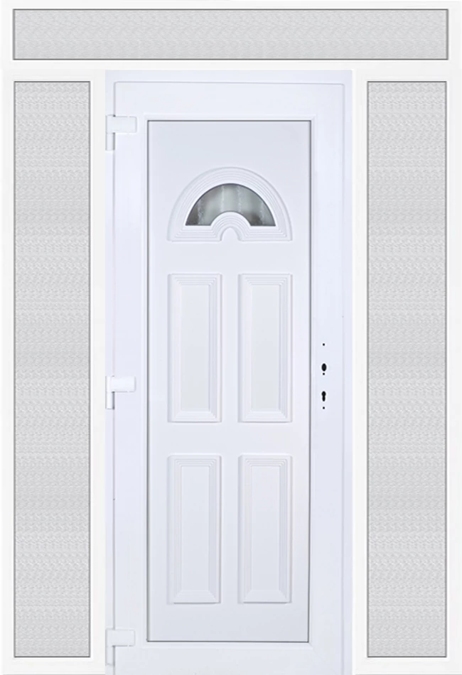 EXTRA hőszigetelésű műanyag bejárati ajtó 5 kamrás profilból, 70 mm beépítési mélységgel, tokban körbefutó idomacél merevítéssel. Vasalat: kilincsműködtetésű, 5 pontos ajtózárral, 3 db 3D erősített ajtópánttal, 20mm magas hőhídmentes alumínium küszöbbel, + 20mm purenittel a küszöb alatt. Dupla szürke ütközőtömítéssel rendelkezik. Üvegezése "savmart" katedrál 3 RÉTEGŰ Szuperlágybevonatos thermo üveg, 42 mm vastagságban, UG értéke: 0,7 W/m2K . A bejárati ajtó mindkét oldalán fehér színű. Nyitásmódja befelé nyíló, nyitásiránya balos ( bentről nézve a zsanér a bal oldalon helyezkedik el ). Tényleges tokkülmérete: 178 cm széles 239 cm magas. 98 cm széles 209 cm magas bejárati ajtóból, és 2 darab 40 cm széles 209 cm magas fix "savmart" üvegezésű ( nem nyitható) oldalvilágítóból és egy 178 cm széles 30 cm magas fix "savmart" üvegezésű ( nem nyitható) felülvilágítóból áll. ( négy külön elem ami beépítéskor összeszerelendő). A nyílászáró ára nem tartalmazza a KILINCSET és a ZÁRBETÉTET a beszereléshez szükséges segédanyagokat (falkampó, csavar, pur-hab..stb.), külső-belső takaróléceket.