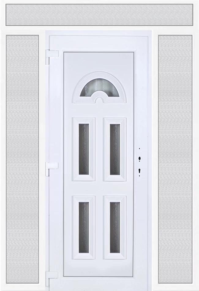 EXTRA hőszigetelésű műanyag bejárati ajtó 5 kamrás profilból, 70 mm beépítési mélységgel, tokban körbefutó idomacél merevítéssel. Vasalat: kilincsműködtetésű, 5 pontos ajtózárral, 3 db 3D erősített ajtópánttal, 20mm magas hőhídmentes alumínium küszöbbel, + 20mm purenittel a küszöb alatt. Dupla szürke ütközőtömítéssel rendelkezik. Üvegezése "savmart" katedrál 3 RÉTEGŰ Szuperlágybevonatos thermo üveg, 42 mm vastagságban, UG értéke: 0,7 W/m2K . A bejárati ajtó mindkét oldalán fehér színű. Nyitásmódja befelé nyíló, nyitásiránya balos ( bentről nézve a zsanér a bal oldalon helyezkedik el ). Tényleges tokkülmérete: 178 cm széles 239 cm magas. 98 cm széles 209 cm magas bejárati ajtóból, és 2 darab 40 cm széles 209 cm magas fix "savmart" üvegezésű ( nem nyitható) oldalvilágítóból és egy 178 cm széles 30 cm magas fix "savmart" üvegezésű ( nem nyitható) felülvilágítóból áll. ( négy külön elem ami beépítéskor összeszerelendő). A nyílászáró ára nem tartalmazza a KILINCSET és a ZÁRBETÉTET a beszereléshez szükséges segédanyagokat (falkampó, csavar, pur-hab..stb.), külső-belső takaróléceket.