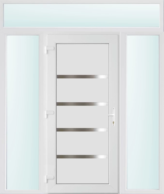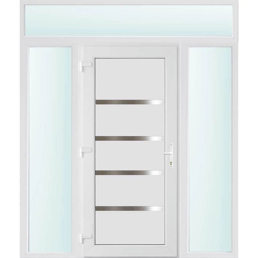 Kiváló hőszigetelésű műanyag bejárati ajtó 5 kamrás Pro line profilból, 70 mm beépítési mélységgel, tokban körbefutó idomacél merevítéssel. Vasalat: kilincsműködtetésű, VORNE 5 pontos ajtózárral, 3 db 3D erősített ajtópánttal, 20mm magas hőhídmentes alumínium küszöbbel. Dupla szürke ütközőtömítéssel rendelkezik. Üvegezése "SAVMART" katedrál 3 rétegű Szuperlágybevonatos thermo üveg, 40 mm vastagságban, UG értéke: 0.7 W/m2K . A bejárati ajtó mindkét oldalán fehér színű. Nyitásmódja befelé nyíló, nyitásiránya balos ( bentről nézve a zsanér a bal oldalon helyezkedik el ). Tényleges tokkülmérete: 178 cm széles 238 cm magas A nyílászáró ára nem tartalmazza a KILINCSET és a ZÁRBETÉTET a beszereléshez szükséges segédanyagokat (falkampó, csavar, pur-hab..stb.), külső-belső takaróléceket.