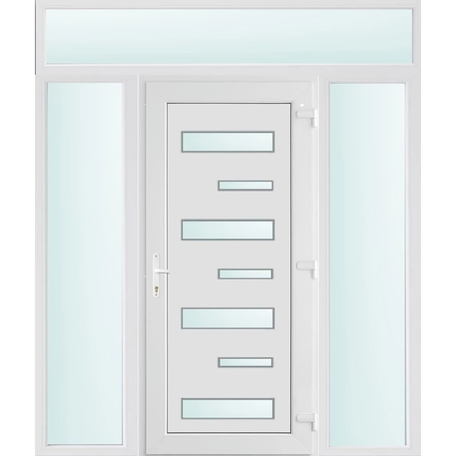 Kiváló hőszigetelésű műanyag bejárati ajtó 5 kamrás profilból, 70 mm beépítési mélységgel, tokban körbefutó idomacél merevítéssel. Vasalat: kilincsműködtetésű, VORNE 5 pontos ajtózárral, 3 db 3D erősített ajtópánttal, 20mm magas hőhídmentes alumínium küszöbbel. Dupla szürke ütközőtömítéssel rendelkezik. Üvegezése "SAVMART" katedrál 2 rétegű Szuperlágybevonatos thermo üveg, 24 mm vastagságban, UG értéke: 1.0 W/m2K . A bejárati ajtó mindkét oldalán fehér színű. Nyitásmódja befelé nyíló, nyitásiránya jobbos ( bentről nézve a zsanér a jobb oldalon helyezkedik el ). Tényleges tokkülmérete: 178 cm széles 238 cm magas. 98 cm széles 208 cm magas bejárati ajtóból, és 2 darab 40 cm széles 208 cm magas fix "SAVMART" üvegezésű ( nem nyitható) oldalvilágítóból és egy 178 cm széles 30 cm magas fix "SAVMART" üvegezésű ( nem nyitható) felülvilágítóból áll. ( négy külön elem ami beépítéskor összeszerelendő). A nyílászáró ára nem tartalmazza a KILINCSET és a ZÁRBETÉTET a beszereléshez szükséges segédanyagokat (falkampó, csavar, pur-hab..stb.), külső-belső takaróléceket.