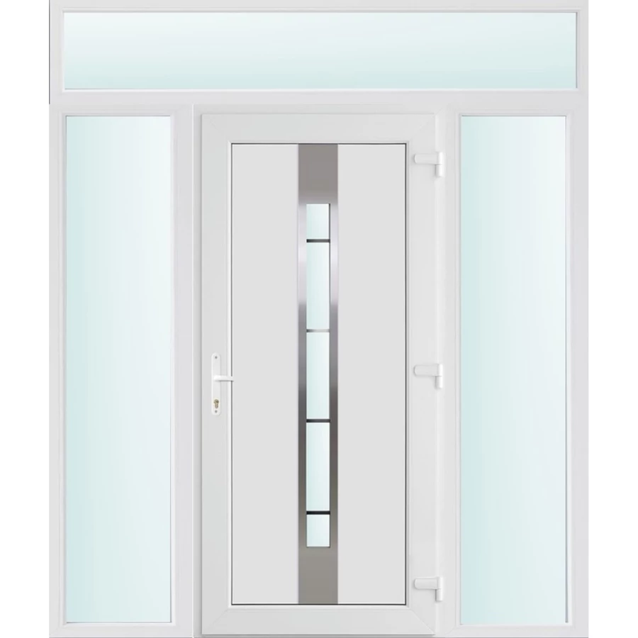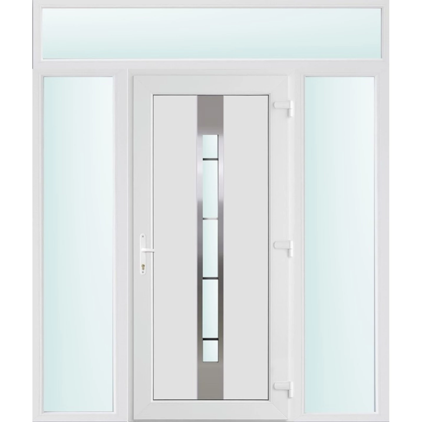 Kiváló hőszigetelésű műanyag bejárati ajtó 5 kamrás Pro line profilból, 70 mm beépítési mélységgel, tokban körbefutó idomacél merevítéssel. Vasalat: kilincsműködtetésű, VORNE 5 pontos ajtózárral, 3 db 3D erősített ajtópánttal, 20mm magas hőhídmentes alumínium küszöbbel. Dupla szürke ütközőtömítéssel rendelkezik. Üvegezése "SAVMART" katedrál 3 rétegű Szuperlágybevonatos thermo üveg, 40 mm vastagságban, UG értéke: 0.7 W/m2K . A bejárati ajtó mindkét oldalán fehér színű. Nyitásmódja befelé nyíló, nyitásiránya jobbos ( bentről nézve a zsanér a bal oldalon helyezkedik el ). Tényleges tokkülmérete: 178 cm széles 238 cm magas A nyílászáró ára nem tartalmazza a KILINCSET és a ZÁRBETÉTET a beszereléshez szükséges segédanyagokat (falkampó, csavar, pur-hab..stb.), külső-belső takaróléceket.
