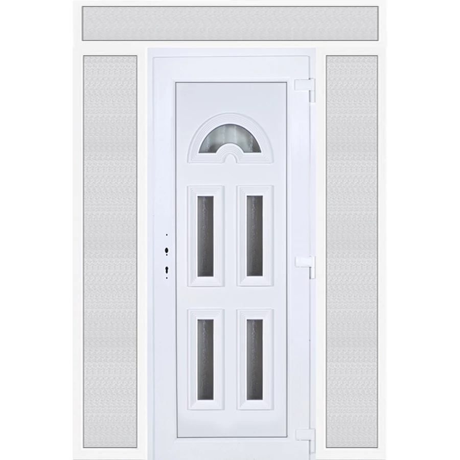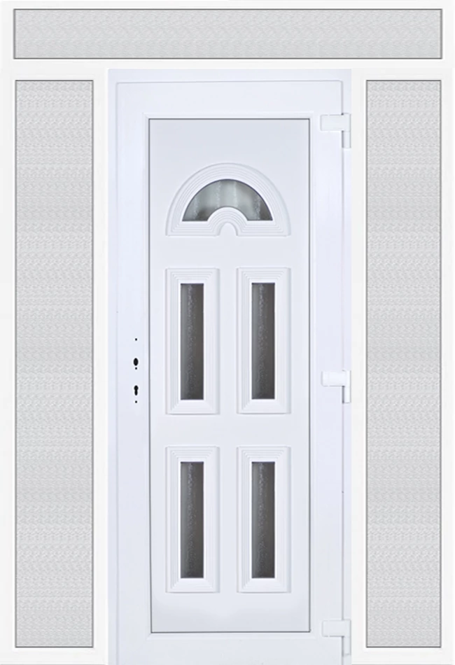 Kiváló hőszigetelésű műanyag bejárati ajtó 5 kamrás profilból, 70 mm beépítési mélységgel, tokban körbefutó idomacél merevítéssel. Vasalat: kilincsműködtetésű, 5 pontos ajtózárral, 3 db 3D erősített ajtópánttal, 35mm magas hőhídmentes alumínium küszöbbel. Dupla szürke ütközőtömítéssel rendelkezik. Üvegezése "GRÍZ" katedrál 2 rétegű Szuperlágybevonatos thermo üveg, 24 mm vastagságban, UG értéke: 1.0 W/m2K . A bejárati ajtó mindkét oldalán fehér színű. Nyitásmódja befelé nyíló, nyitásiránya jobbos ( bentről nézve a zsanér a jobb oldalon helyezkedik el ). Tényleges tokkülmérete: 178 cm széles 238,5 cm magas. 98 cm széles 208,5 cm magas bejárati ajtóból, és 2 darab 40 cm széles 208,5 cm magas fix "GRÍZ" üvegezésű ( nem nyitható) oldalvilágítóból és egy 178 cm széles 30 cm magas fix "GRÍZ" üvegezésű ( nem nyitható) felülvilágítóból áll. ( négy külön elem ami beépítéskor összeszerelendő). A nyílászáró ára nem tartalmazza a KILINCSET és a ZÁRBETÉTET a beszereléshez szükséges segédanyagokat (falkampó, csavar, pur-hab..stb.), külső-belső takaróléceket.