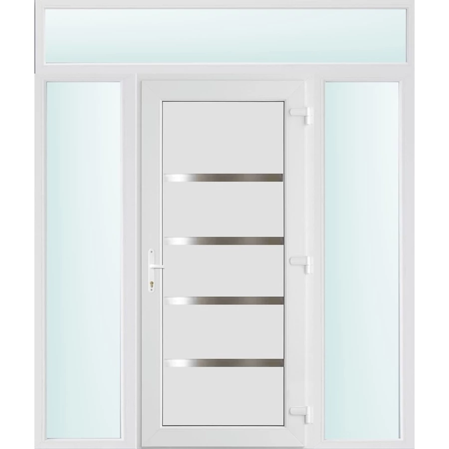 Kiváló hőszigetelésű műanyag bejárati ajtó 5 kamrás Pro line profilból, 70 mm beépítési mélységgel, tokban körbefutó idomacél merevítéssel. Vasalat: kilincsműködtetésű, VORNE 5 pontos ajtózárral, 3 db 3D erősített ajtópánttal, 20mm magas hőhídmentes alumínium küszöbbel. Dupla szürke ütközőtömítéssel rendelkezik. Üvegezése "SAVMART" katedrál 3 rétegű Szuperlágybevonatos thermo üveg, 40 mm vastagságban, UG értéke: 0.7 W/m2K . A bejárati ajtó mindkét oldalán fehér színű. Nyitásmódja befelé nyíló, nyitásiránya jobbos ( bentről nézve a zsanér a bal oldalon helyezkedik el ). Tényleges tokkülmérete: 178 cm széles 238 cm magas A nyílászáró ára nem tartalmazza a KILINCSET és a ZÁRBETÉTET a beszereléshez szükséges segédanyagokat (falkampó, csavar, pur-hab..stb.), külső-belső takaróléceket.