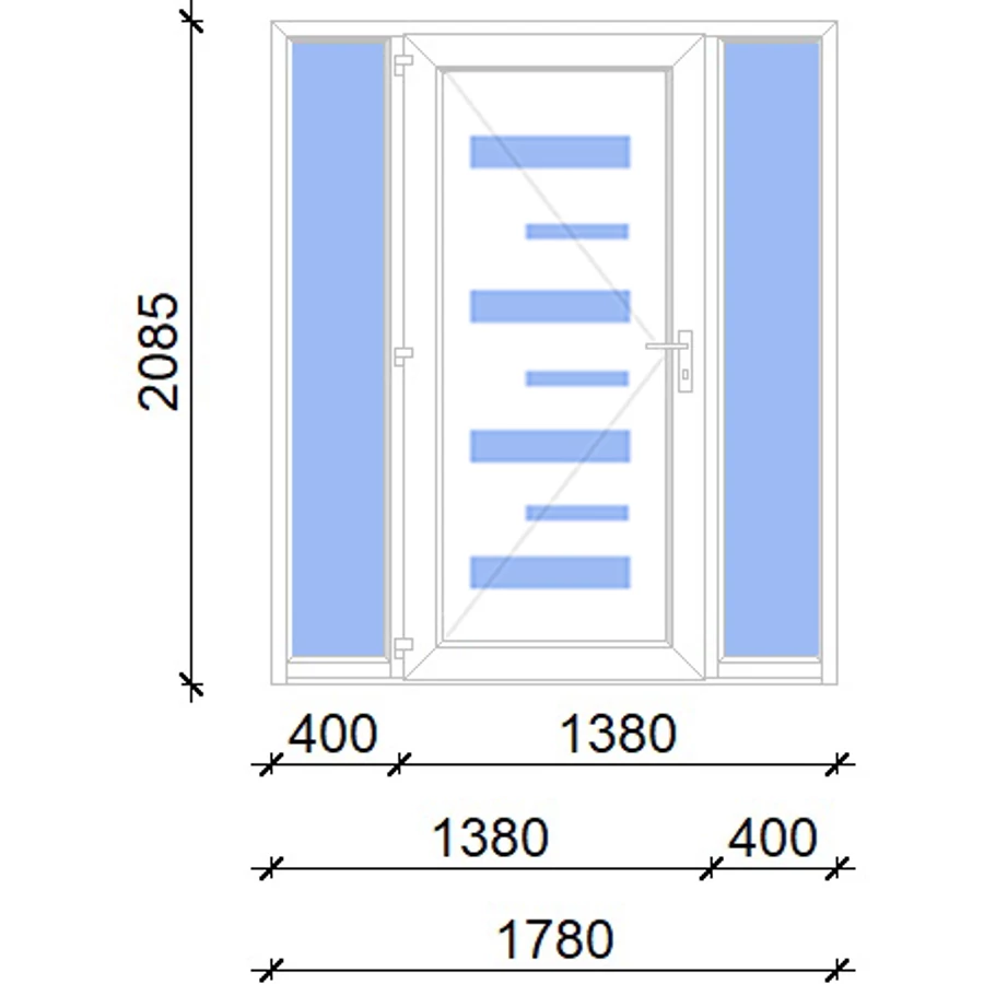 Kiváló hőszigetelésű műanyag bejárati ajtó 5 kamrás profilból, 70 mm beépítési mélységgel, tokban körbefutó idomacél merevítéssel. Vasalat: kilincsműködtetésű, VORNE 5 pontos ajtózárral, 3 db 3D erősített ajtópánttal, 20mm magas hőhídmentes alumínium küszöbbel. Dupla szürke ütközőtömítéssel rendelkezik. Üvegezése "SAVMART" katedrál 2 rétegű Szuperlágybevonatos thermo üveg, 24 mm vastagságban, UG értéke: 1.0 W/m2K . A bejárati ajtó mindkét oldalán fehér színű. Nyitásmódja befelé nyíló, nyitásiránya balos ( bentről nézve a zsanér a bal oldalon helyezkedik el ). Tényleges tokkülmérete: 198 cm széles 208 cm magas. 98 cm széles 208 cm magas bejárati ajtóból, és 2 darab 50 cm széles 208 cm magas fix "SAVMART" üvegezésű ( nem nyitható) oldalvilágítóból áll. ( 3 külön elem ami beépítéskor összeszerelendő). A nyílászáró ára nem tartalmazza a KILINCSET és a ZÁRBETÉTET a beszereléshez szükséges segédanyagokat (falkampó, csavar, pur-hab..stb.), külső-belső takaróléceket.