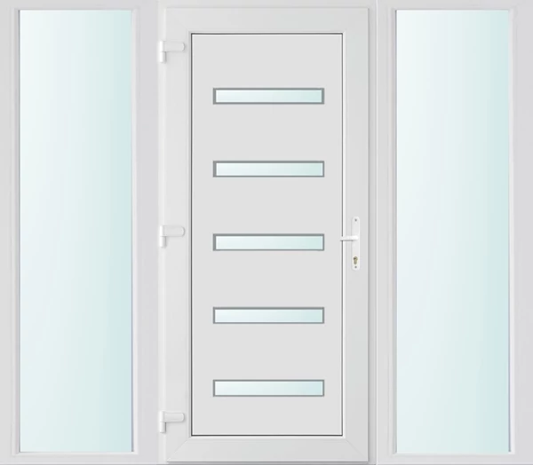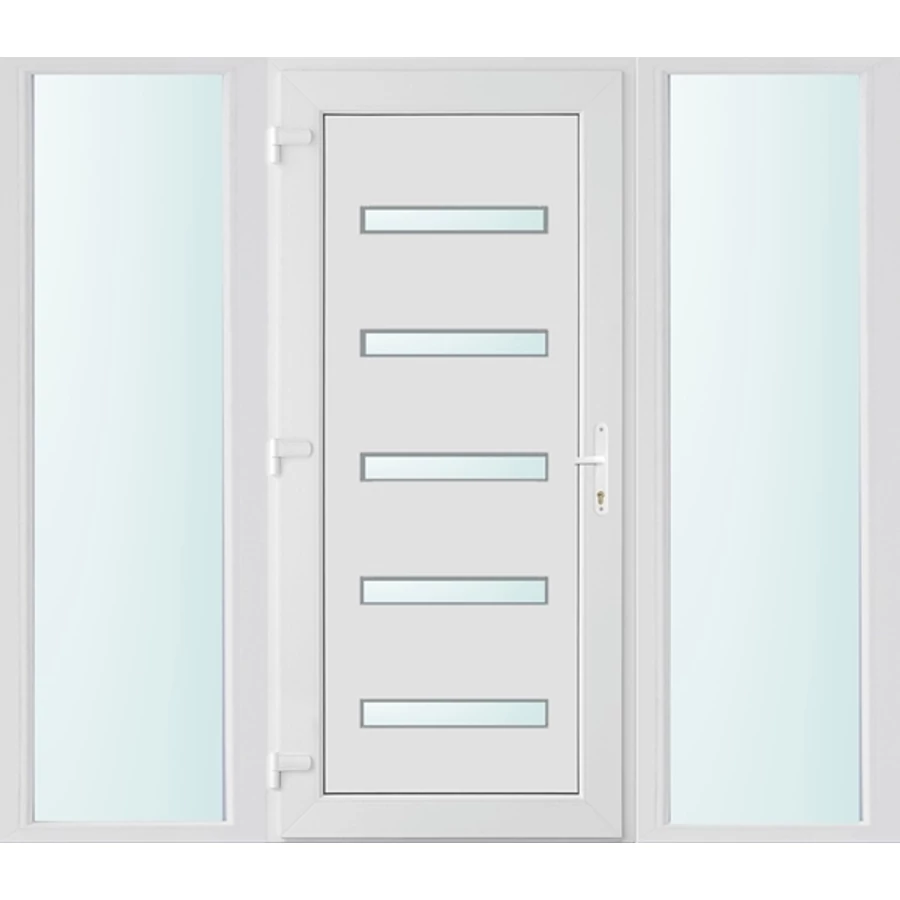 Kiváló hőszigetelésű műanyag bejárati ajtó 5 kamrás profilból, 70 mm beépítési mélységgel, tokban körbefutó idomacél merevítéssel. Vasalat: kilincsműködtetésű, VORNE 5 pontos ajtózárral, 3 db 3D erősített ajtópánttal, 20mm magas hőhídmentes alumínium küszöbbel. Dupla szürke ütközőtömítéssel rendelkezik. Üvegezése "SAVMART" katedrál 2 rétegű Szuperlágybevonatos thermo üveg, 24 mm vastagságban, UG értéke: 1.0 W/m2K . A bejárati ajtó mindkét oldalán fehér színű. Nyitásmódja befelé nyíló, nyitásiránya balos ( bentről nézve a zsanér a bal oldalon helyezkedik el ). Tényleges tokkülmérete: 198 cm széles 208 cm magas. 98 cm széles 208 cm magas bejárati ajtóból, és 2 darab 50 cm széles 208 cm magas fix "SAVMART" üvegezésű ( nem nyitható) oldalvilágítóból áll. ( 3 külön elem ami beépítéskor összeszerelendő). A nyílászáró ára nem tartalmazza a KILINCSET és a ZÁRBETÉTET a beszereléshez szükséges segédanyagokat (falkampó, csavar, pur-hab..stb.), külső-belső takaróléceket.