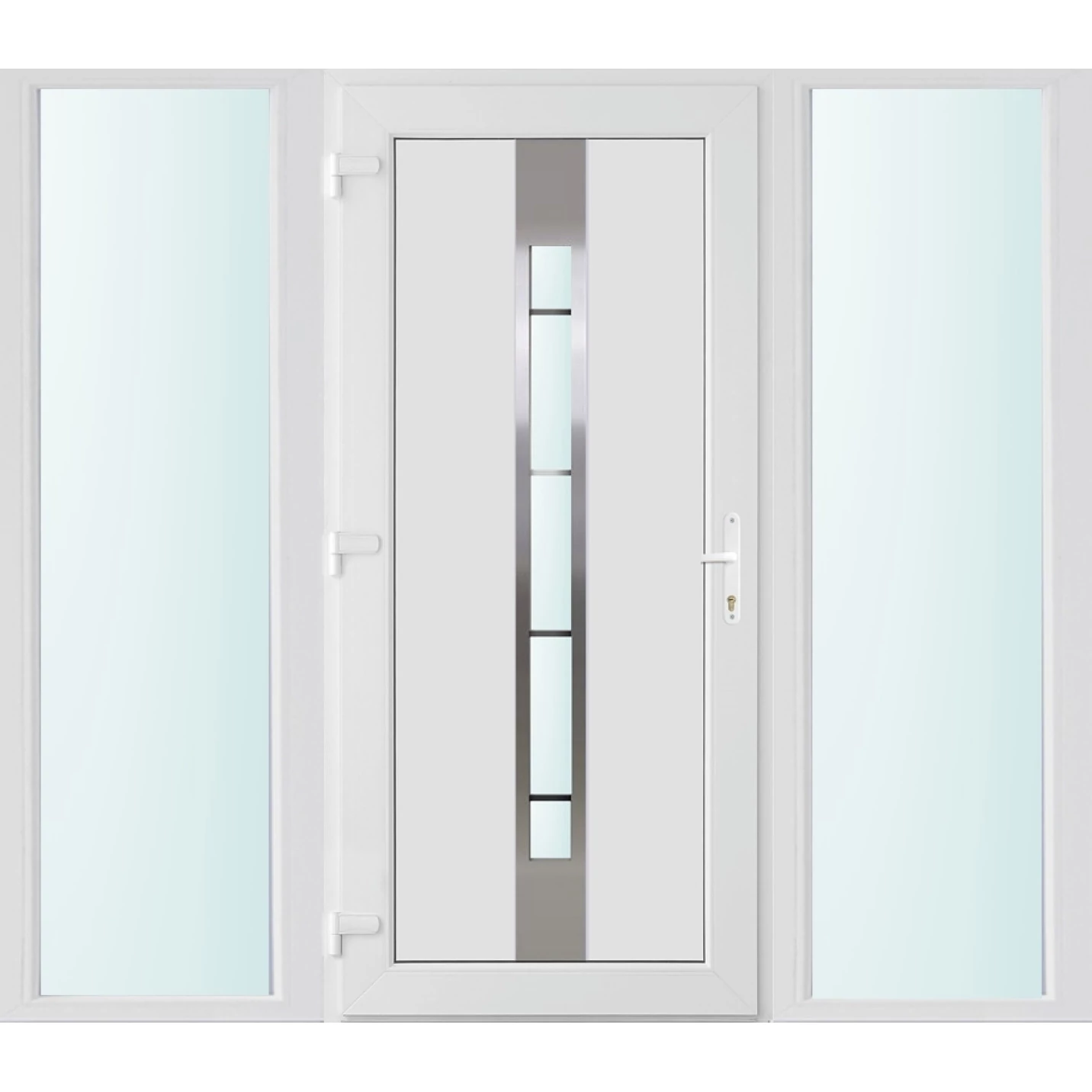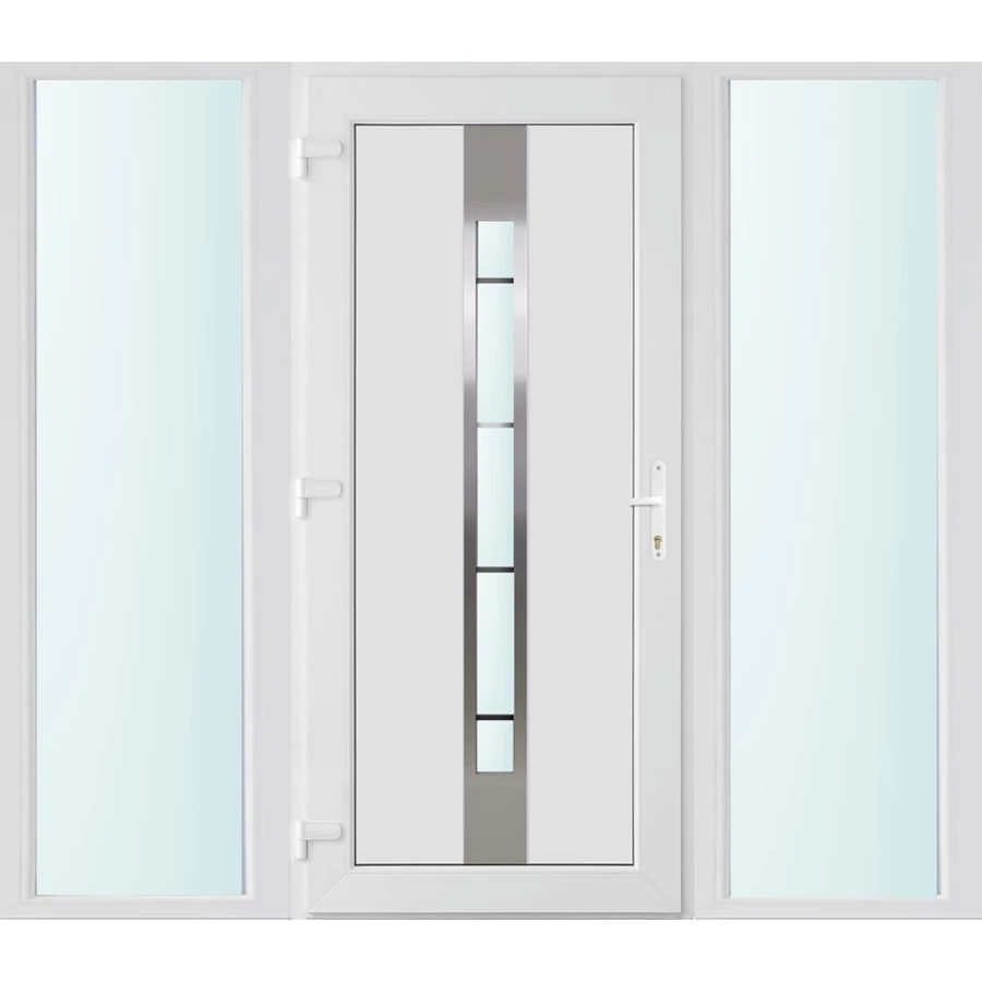 Kiváló hőszigetelésű műanyag bejárati ajtó 5 kamrás Pro line profilból, 70 mm beépítési mélységgel, tokban körbefutó idomacél merevítéssel. Vasalat: kilincsműködtetésű, VORNE 5 pontos ajtózárral, 3 db 3D erősített ajtópánttal, 20mm magas hőhídmentes alumínium küszöbbel. Dupla szürke ütközőtömítéssel rendelkezik. Üvegezése "SAVMART" katedrál 3 rétegű Szuperlágybevonatos thermo üveg, 40 mm vastagságban, UG értéke: 0.7 W/m2K . A bejárati ajtó mindkét oldalán fehér színű. Nyitásmódja befelé nyíló, nyitásiránya balos ( bentről nézve a zsanér a bal oldalon helyezkedik el ). Tényleges tokkülmérete: 198 cm széles 208 cm magas A nyílászáró ára nem tartalmazza a KILINCSET és a ZÁRBETÉTET a beszereléshez szükséges segédanyagokat (falkampó, csavar, pur-hab..stb.), külső-belső takaróléceket.
