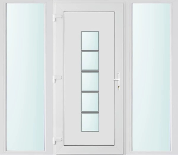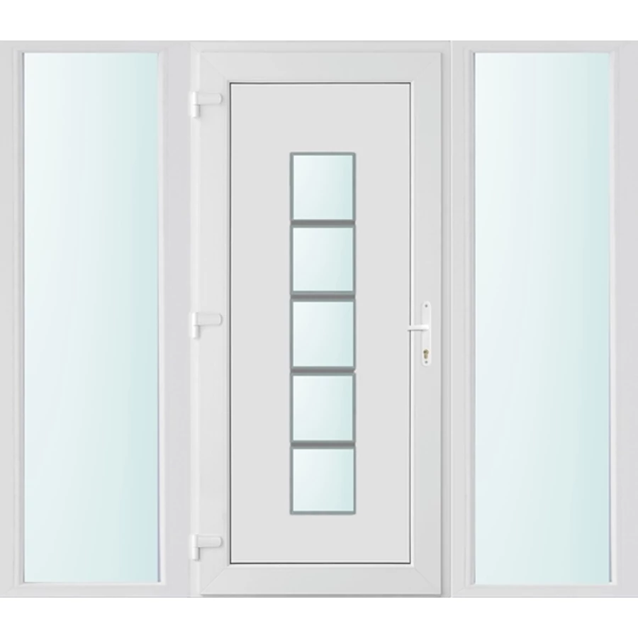 Kiváló hőszigetelésű műanyag bejárati ajtó 5 kamrás profilból, 70 mm beépítési mélységgel, tokban körbefutó idomacél merevítéssel. Vasalat: kilincsműködtetésű, VORNE 5 pontos ajtózárral, 3 db 3D erősített ajtópánttal, 20mm magas hőhídmentes alumínium küszöbbel. Dupla szürke ütközőtömítéssel rendelkezik. Üvegezése "SAVMART" katedrál 2 rétegű Szuperlágybevonatos thermo üveg, 24 mm vastagságban, UG értéke: 1.0 W/m2K . A bejárati ajtó mindkét oldalán fehér színű. Nyitásmódja befelé nyíló, nyitásiránya balos ( bentről nézve a zsanér a bal oldalon helyezkedik el ). Tényleges tokkülmérete: 198 cm széles 208 cm magas. 98 cm széles 208 cm magas bejárati ajtóból, és 2 darab 50 cm széles 208 cm magas fix "SAVMART" üvegezésű ( nem nyitható) oldalvilágítóból áll. ( 3 külön elem ami beépítéskor összeszerelendő). A nyílászáró ára nem tartalmazza a KILINCSET és a ZÁRBETÉTET a beszereléshez szükséges segédanyagokat (falkampó, csavar, pur-hab..stb.), külső-belső takaróléceket.
