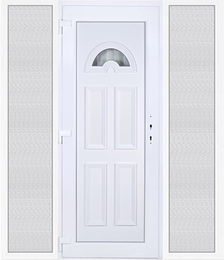 Kiváló hőszigetelésű műanyag bejárati ajtó 5 kamrás profilból, 70 mm beépítési mélységgel, tokban körbefutó idomacél merevítéssel. Vasalat: kilincsműködtetésű, 5 pontos ajtózárral, 3 db 3D erősített ajtópánttal, 35mm magas hőhídmentes alumínium küszöbbel. Dupla szürke ütközőtömítéssel rendelkezik. Üvegezése "GRÍZ" katedrál 2 rétegű Szuperlágybevonatos thermo üveg, 24 mm vastagságban, UG értéke: 1.0 W/m2K . A bejárati ajtó mindkét oldalán fehér színű. Nyitásmódja befelé nyíló, nyitásiránya balos ( bentről nézve a zsanér a bal oldalon helyezkedik el ). Tényleges tokkülmérete: 198 cm széles 208,5 cm magas. 98 cm széles 208,5 cm magas bejárati ajtóból, és 2 darab 50 cm széles 208,5 cm magas fix "GRÍZ" üvegezésű ( nem nyitható) oldalvilágítóból áll. ( 3 külön elem ami beépítéskor összeszerelendő). A nyílászáró ára nem tartalmazza a KILINCSET és a ZÁRBETÉTET a beszereléshez szükséges segédanyagokat (falkampó, csavar, pur-hab..stb.), külső-belső takaróléceket.